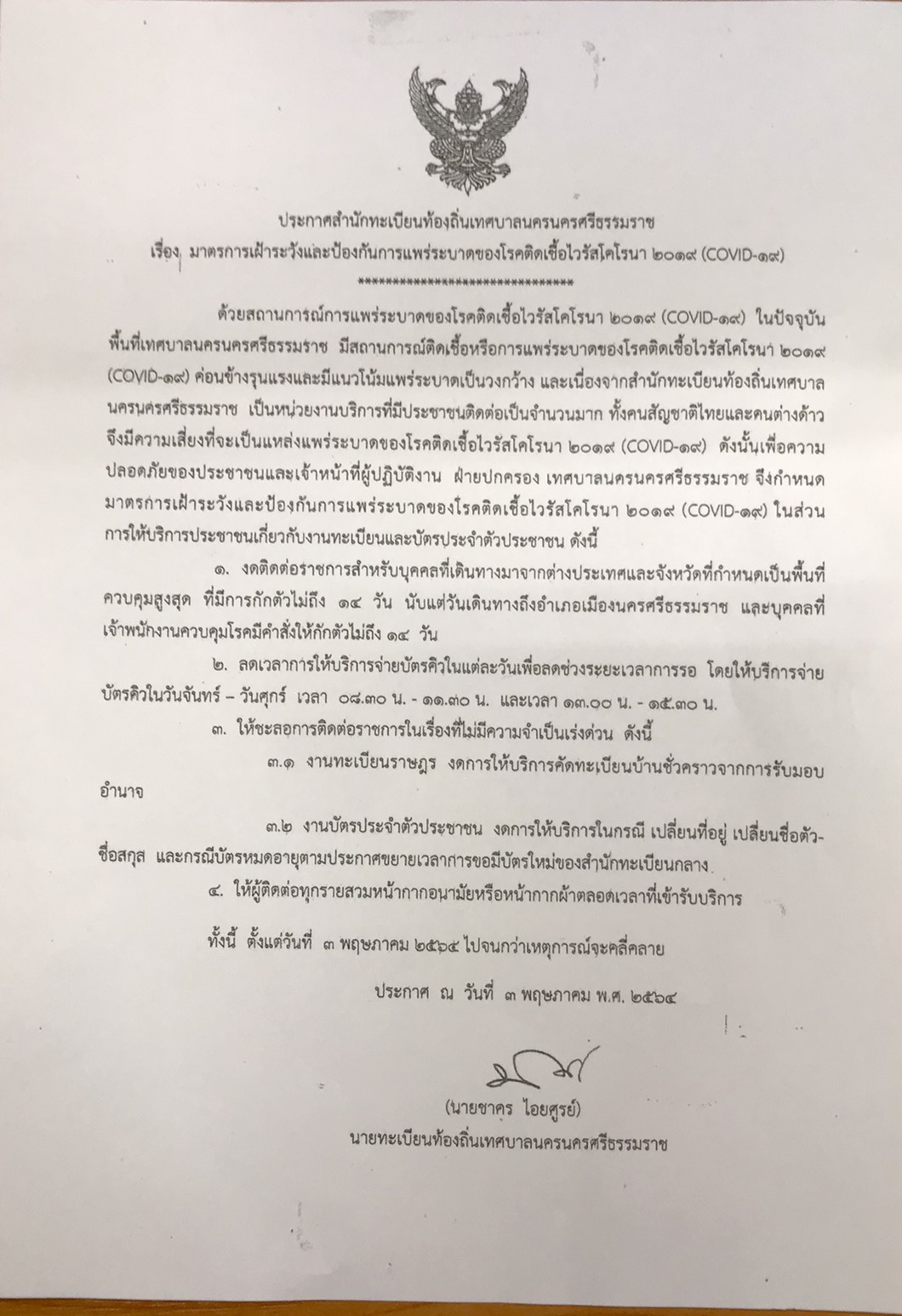 เทศบาลนครนครศรีธรรมราช ภายใต้การนำของ ดร.กณพ เกตุชาติ นายกเทศมนตรีนครนครศรีธรรมราช โดยงานทะเบียนราษฎรและงานบัตรประจำตัวประชาชน สำนักทะเบียนท้องถิ่นเทศบาลนครนครศรีธรรมราช จึงกำหนดมาตรการเฝ้าระวังและป้องกันการแพร่ระบาดของโรคติดเชื้อไวรัสโคโรนา 2019 (COVID -19) เพื่อความปลอดภัยของประชาชนและเจ้าหน้าที่ผู้ปฏิบัติงาน ดังนี้