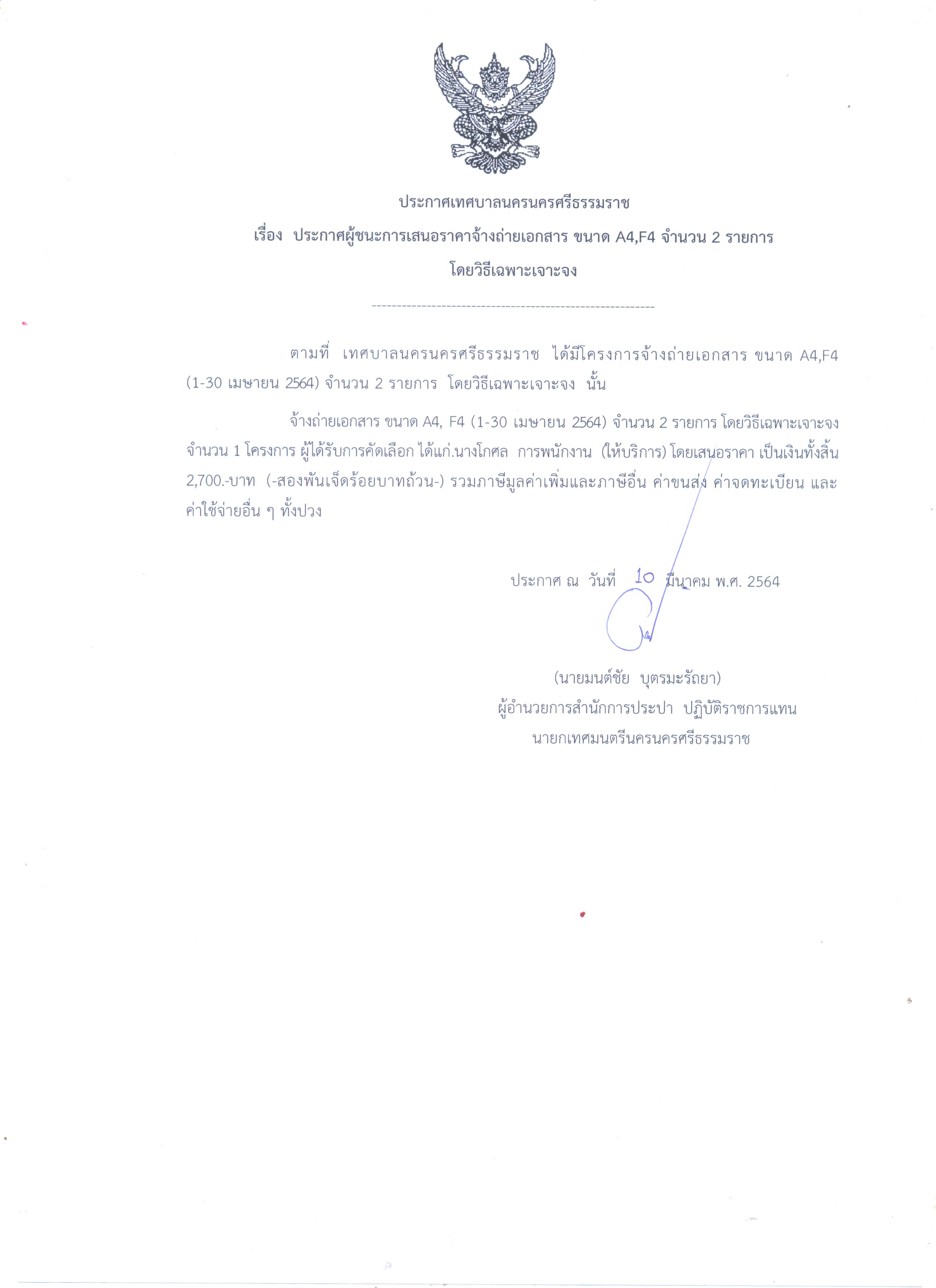 จ้างถ่ายเอกสาร ขนาด A4,F4 (1-30 เมษายน 2564) จำนวน 2 รายการ โดยวิธีเฉพาะเจาะจง ผู้ได้รับการคัดเลือก ได้แก่.