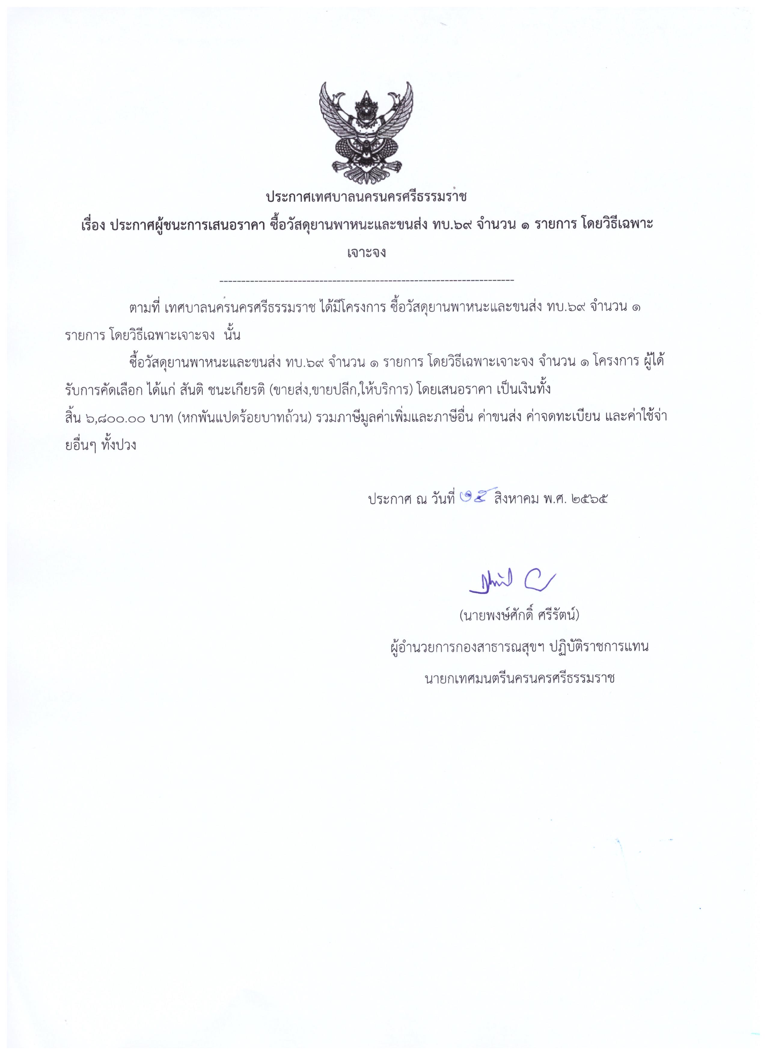 ประกาศผู้ชนะการเสนอราคา ซื้อวัสดุยานพาหนะและขนส่ง ทบ 69 จำนวน 1 รายการ โดยวิธีเฉพาะเจาะจง
