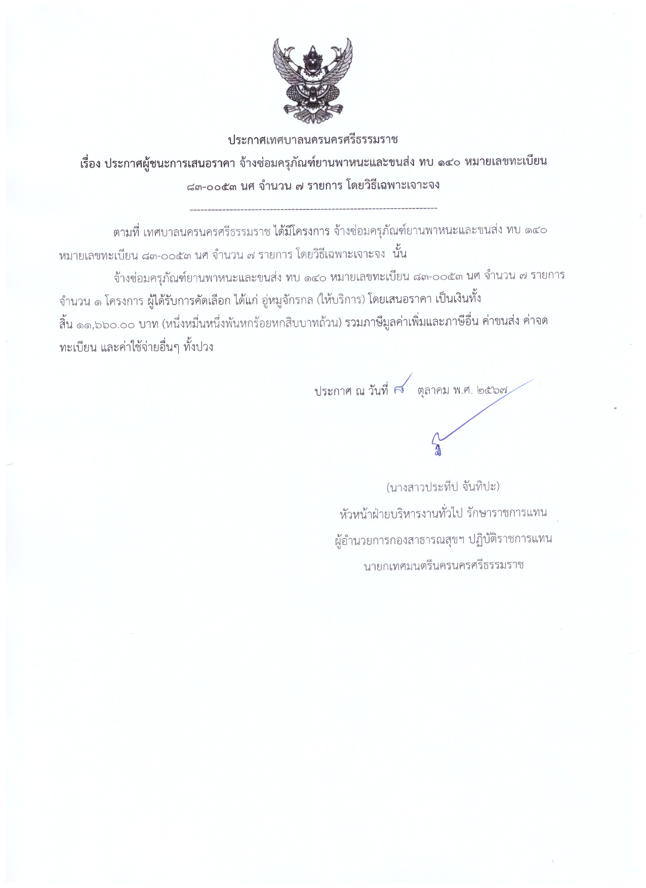 <ประกาศผู้ชนะการเสนอราคา จ้างซ่อมครุภัณฑ์ยานพาหนะและขนส่ง ทบ 140 หมายเลขทะเบียน 83-0053 นศ จำนวน 7 รายการ