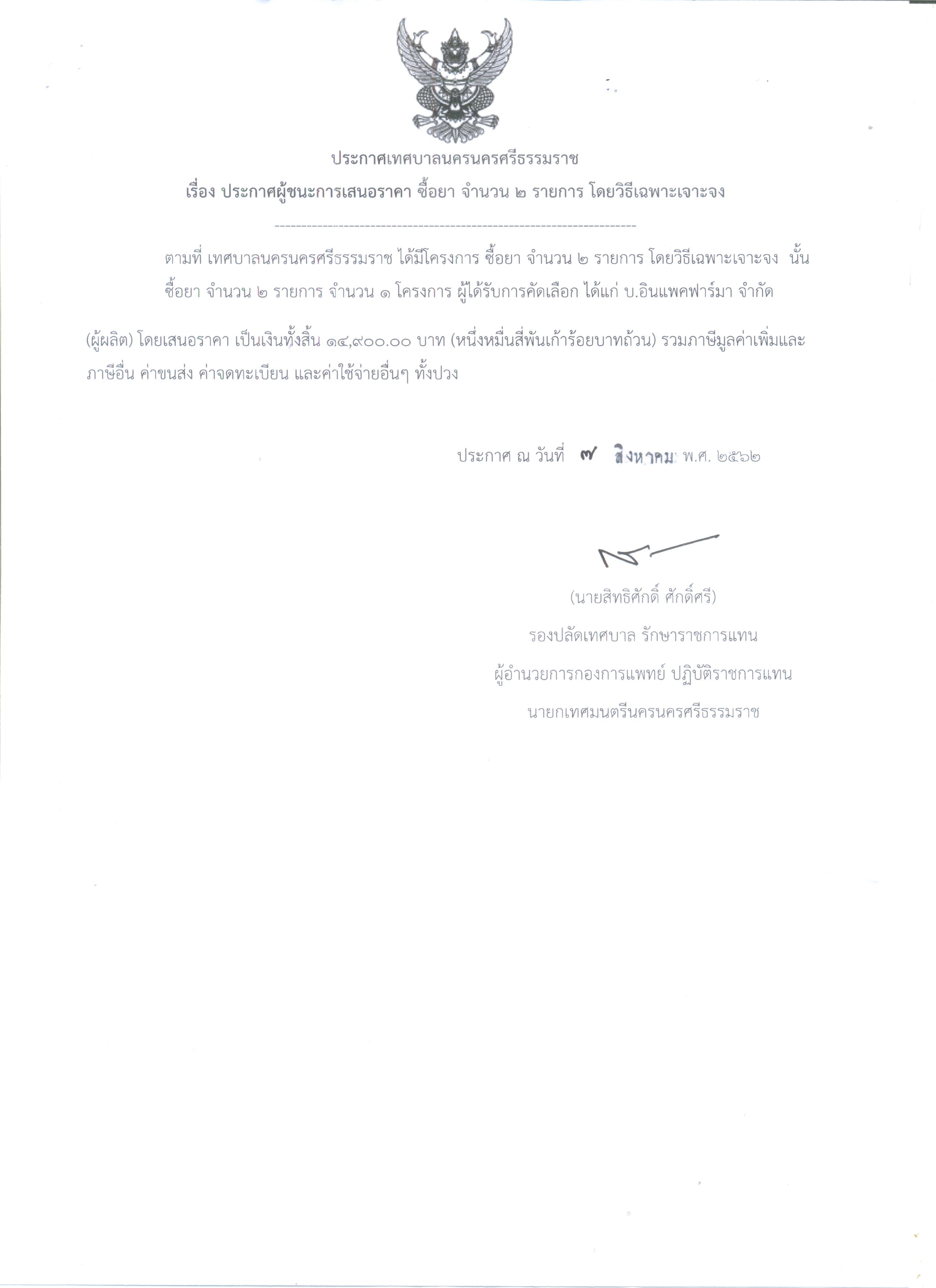 ประกาศผู้ชนะการเสนอราคา ซื้อยา จำนวน 2 รายการ โดยวิธีเฉพาะเจาะจง