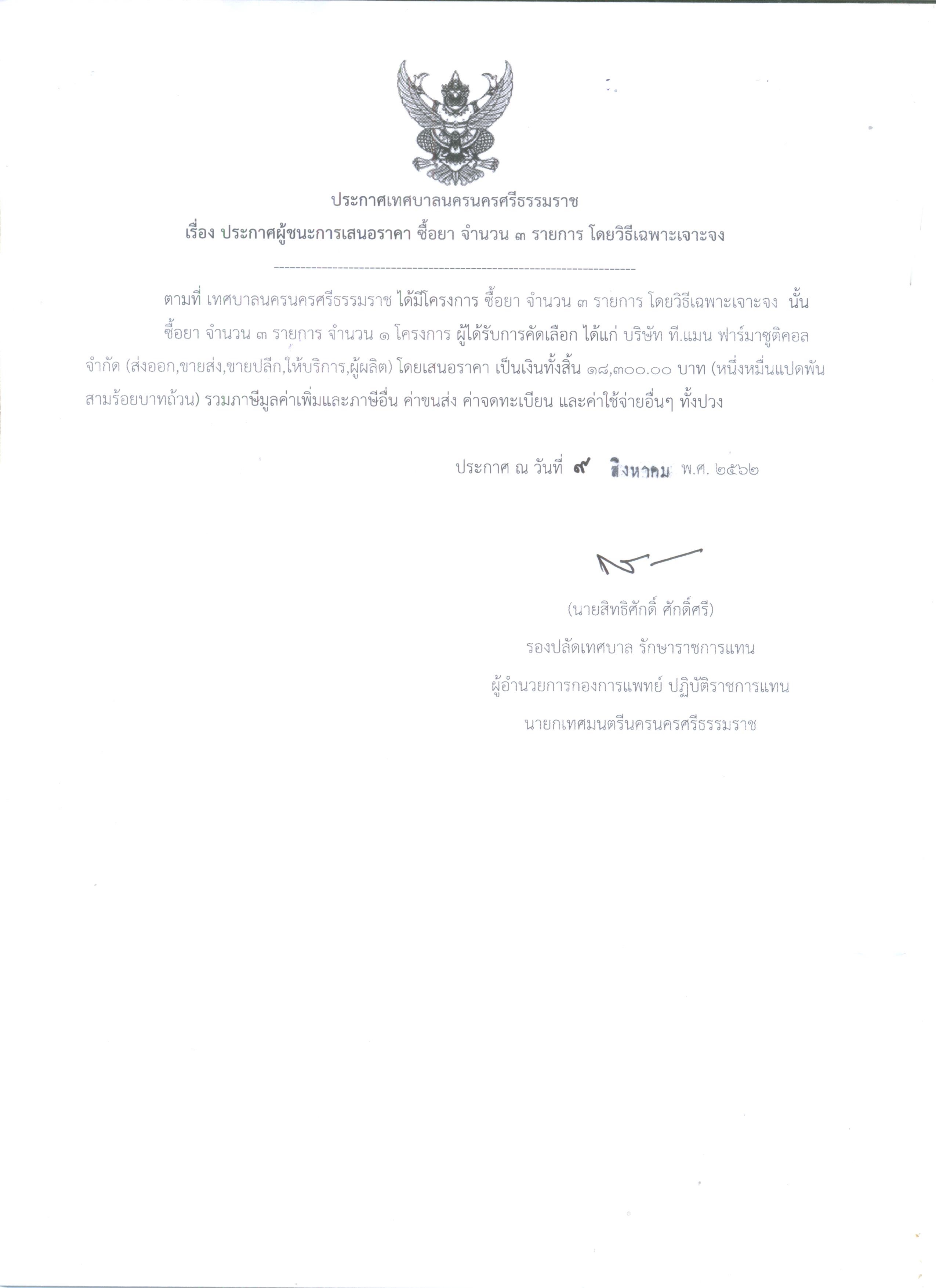 ประกาศผู้ชนะการเสนอราคา ซื้อยา จำนวน 3 รายการ โดยวิธีเฉพาะเจาะจง