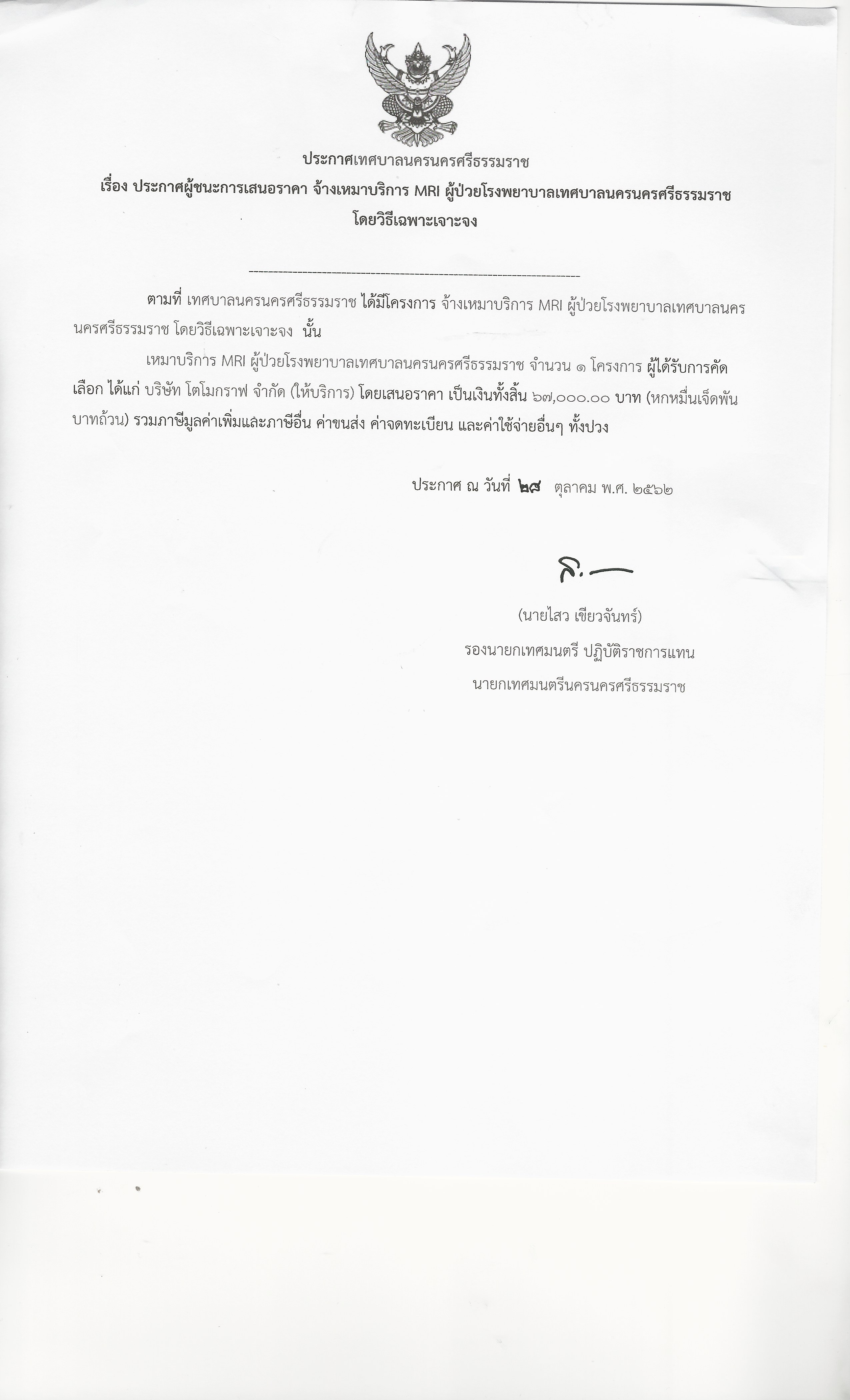 ประกาศผู้ชนะการเสนอราคา จ้างเหมาบริการMRI ผู้ป่วยโรงพยาบาลเทศบาลนครนครศรีธรรมราช โดยวิธีเฉพาะเจาะจง