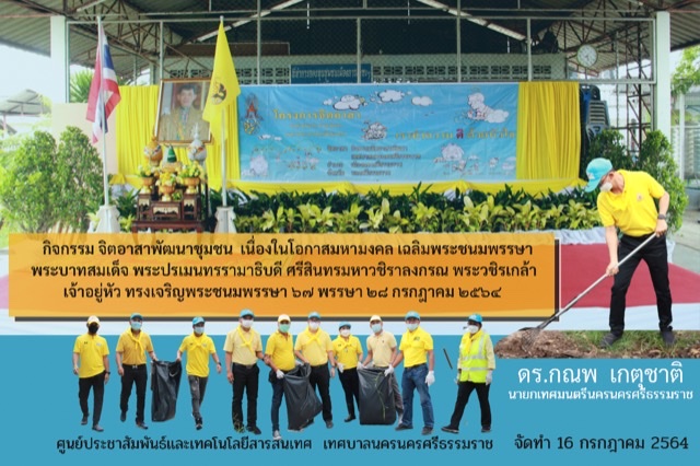 เทศบาลนครนครศรีธรรมราช จัดกิจกรรม จิตอาสาพัฒนาชุมชน เนื่องในโอกาสมหามงคล เฉลิมพระชนมพรรษา พระบาทสมเด็จ พระปรเมนทรรามาธิบดี ศรีสินทรมหาวชิราลงกรณ พระวชิรเกล้าเจ้าอยู่หัว ทรงเจริญพระชนมพรรษา ๖๗ พรรษา ๒๘ กรกฎาคม ๒๕๖๔ |