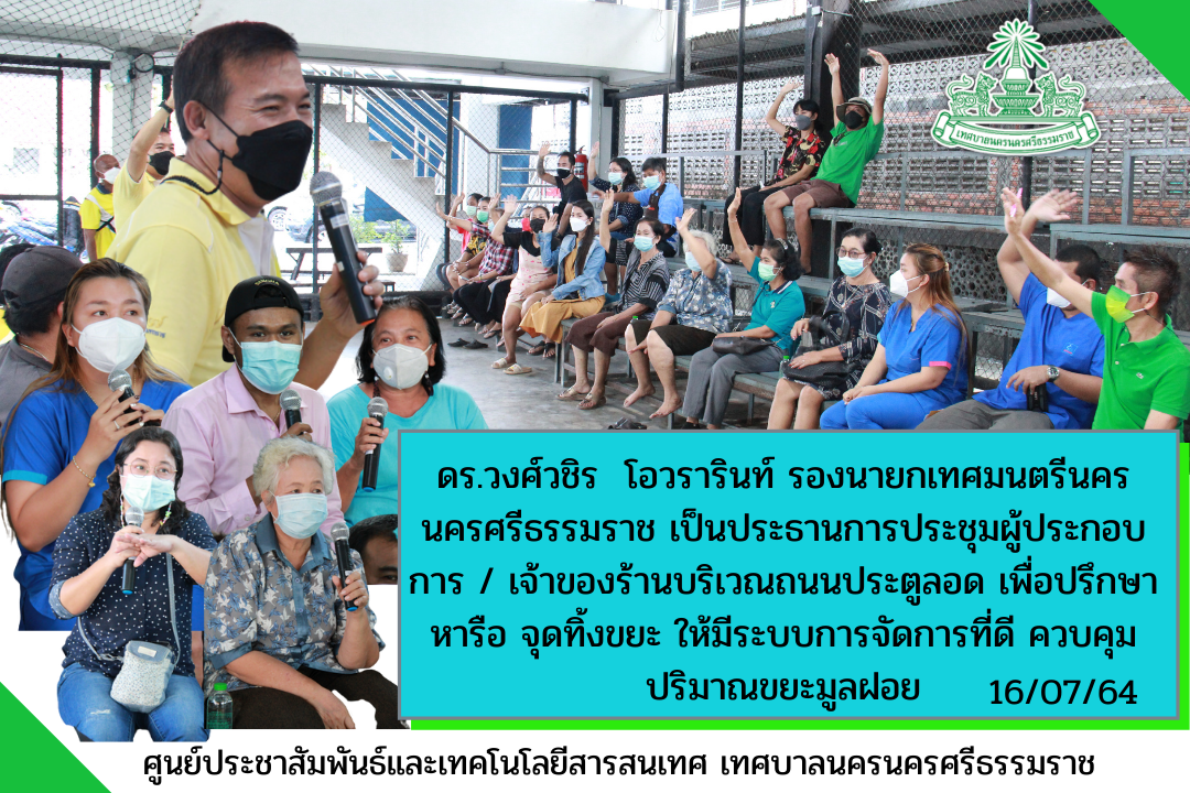 วันศุกร์ ที่ 16 กรกฎาคม 2564 เวลา 17.00 น. ณ  สนามฟุตซอล เทศบาลนครนครศรีธรรมราช ดร.วงศ์วชิร  โอวรารินท์รองนายกเทศมนตรีนครนครศรีธรรมราช เป็นประธานการประชุมผู้ประกอบการ / เจ้าของร้านบริเวณถนนประตูลอด  เพื่อปรึกษาหารือ จุดทิ้งขยะ ให้มีระบบการจัดการที่ดี ควบคุมปริมาณขยะมูลฝอยและเพิ่มประสิทธิภาพในการจัดการขยะที่เกิดจากสถานที่ประกอบ