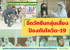 วันศุกร์ ที่ 30 กรกฎาคม 2564 ตั้งแต่เวลา 08.30 -12.00 น. ณ หอประชุมเมือง ( ทุ่งท่าลาด )  ดร.กณพ เกตุชาติ นายกเทศมนตรีนครนครศรีธรรมราช  มอบหมายให้ กองการแพทย์โรงพยาบาลเทศบาลนครนครศรีธรรมราช ดำเนินการฉีดวัคซีนป้องกันโรคโควิด-19 สำหรับผู้ลงทะเบียนกิจการกลุ่มเสี่ยงสูง ซึ่งบรรยากาศเป็นไปด้วยเรียบร้อย มีการเว้นระยะห่างเพื่อความปลอดภัยสำหรับผู้ที่มารอฉีดวัคซีน และมีการตรวจคัดกรองก่อนที่จะเข้ารับการฉีดวัคซีนอย่างเข้มข้น ซึ่งส่วนใหญ่นั้นจะเป็นกลุ่มผู้ประกอบการกลุ่มเสี่ยงสูง