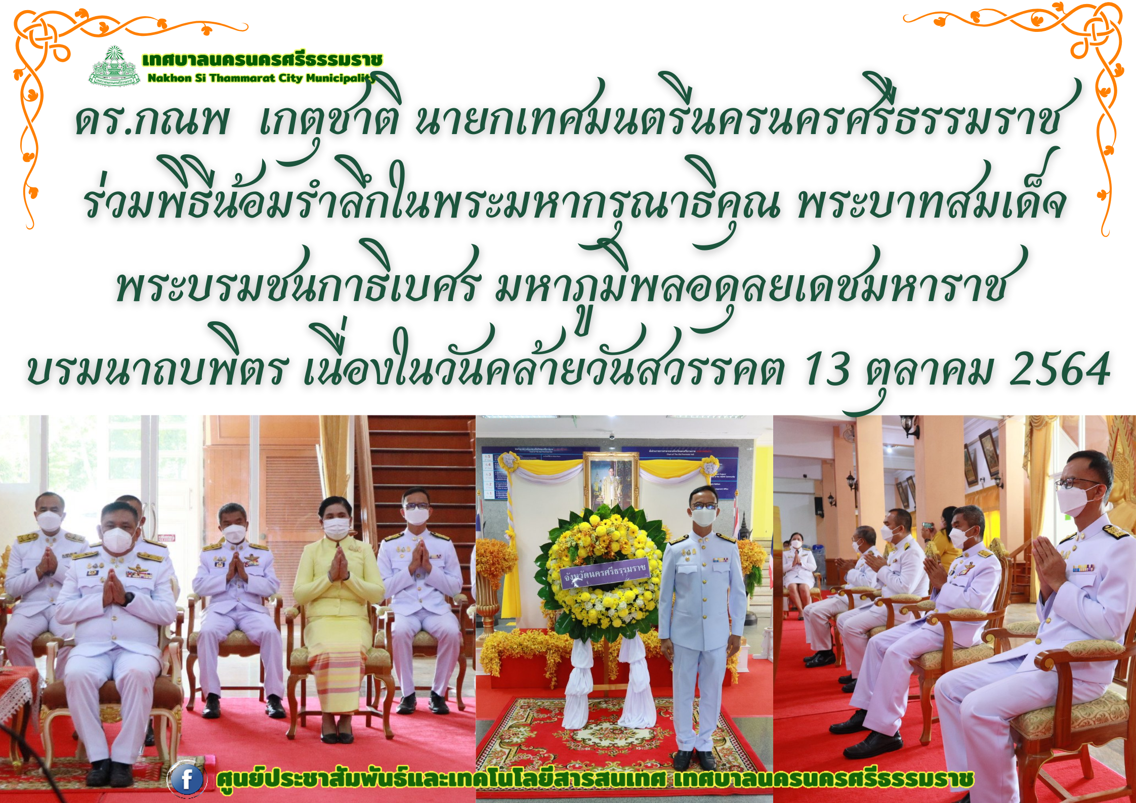 ดร.กณพ เกตุชาติ นายกเทศมนตรีนครนครศรีธรรมราช ร่วมพิธีน้อมรำลึกในพระมหากรุณาธิคุณ พระบาทสมเด็จพระบรมชนกาธิเบศร มหาภูมิพลอดุลยเดชมหาราช บรมนาถบพิตร เนื่องในวันคล้ายวันสวรรคต 13 ตุลาคม 2564 |
