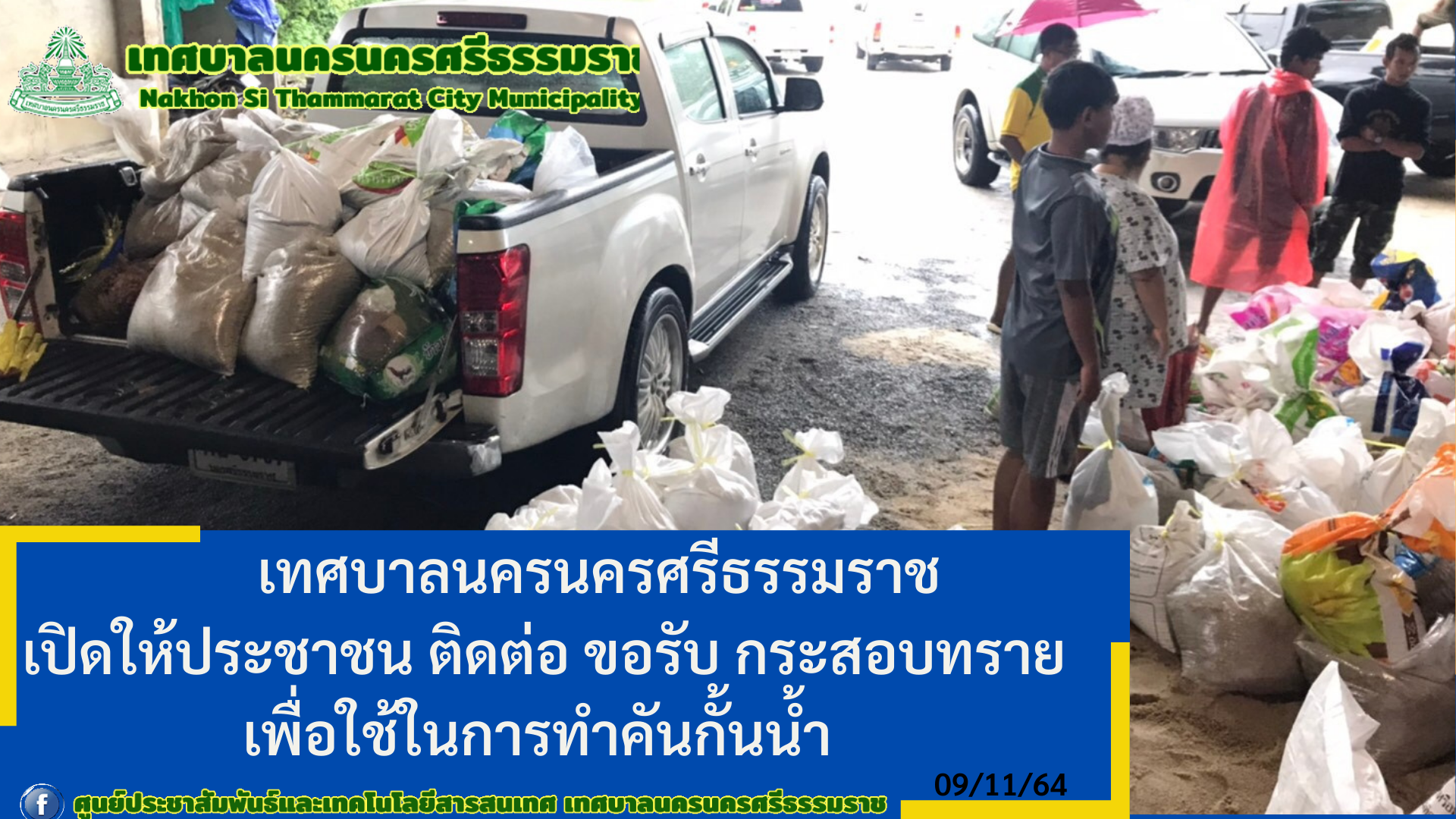 เทศบาลนครนครศรีธรรมราช ภายใต้การนำของ ดร.กณพ  เกตุชาติ  นายกเทศมนตรีนครนครศรีธรรมราช  เปิดให้ประชาชนในเขตเทศบาลนครนครศรีธรรมราช ที่มีความประสงค์รับกระสอบทราย ใช้ในการทำคันกั้นน้ำ เพื่อป้องกันความเสียหายต่อบ้านเรือนและทรัพย์สิน สามารถแจ้งความประสงค์ ติดต่อ ขอรับ ได้ที่ ศูนย์จักรกลเทศบาลนครนครศรีธรรมราช  ในวันจันทร์-วันเสาร์ ตั้งแต่เวลา 08.30-16.30 น. พร้อมนำบัตรประจำตัวประชาชน เพื่อติดต่อขอรับ โดยจำกัดจำนวนให้ 30 กระสอบต่อบ้าน 1 หลัง