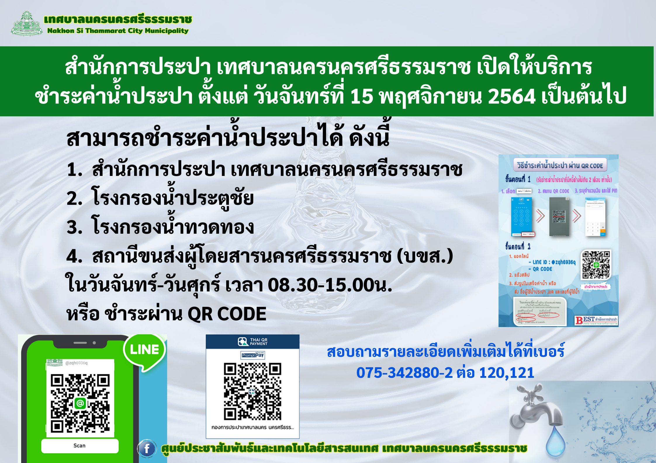สำนักการประปา เทศบาลนครนครศรีธรรมราช เปิดให้บริการ ชำระค่าน้ำประปา  ตั้งแต่ วันจันทร์ที่ 15 พฤศจิกายน 2564 เป็นต้นไป