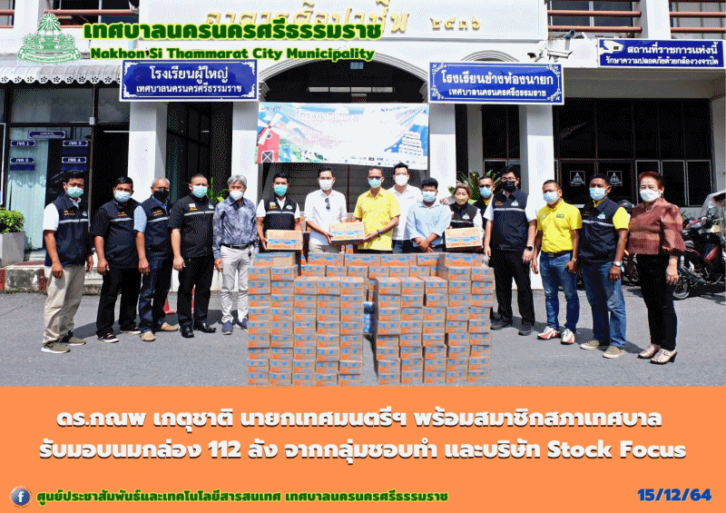 วันพุธ ที่15 ธันวาคม 2564 เวลา 11.30 น. ดร.กณพ เกตุชาติ นายกเทศมนตรีนครนครศรีธรรมราช พร้อมด้วยหัวหน้าส่วน สมาชิกสภาเทศบาล รับมอบนมกล่อง UHT 4000 กล่อง จำนวน (112 ลัง) จากคณะกลุ่มชอบทำ และบริษัท Stock Focus เพื่อแจกจ่ายให้กับเด็กในชุมชนเขตเทศบาลนครนครศรีธรรมราช ต่อไป |