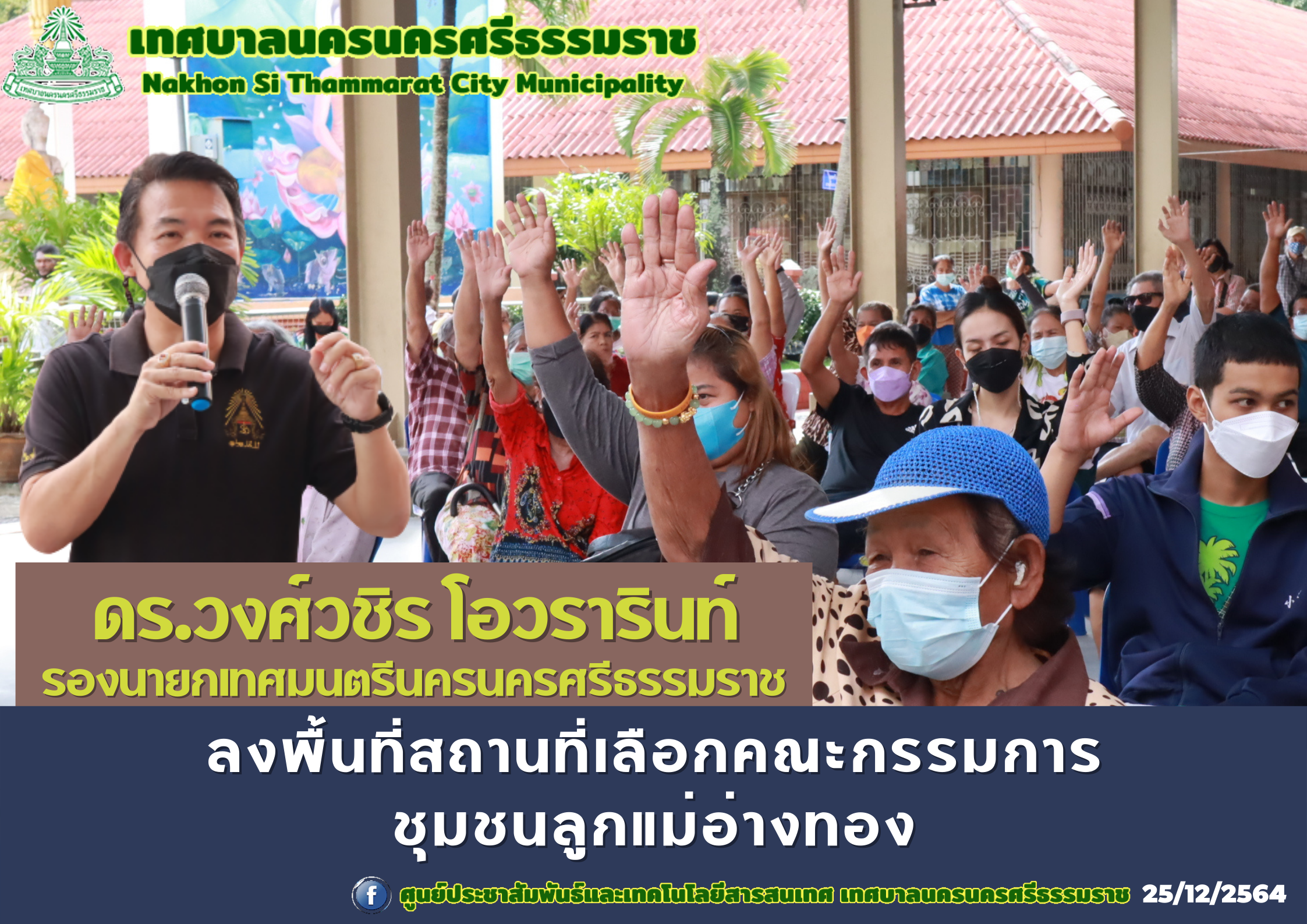 เทศบาลนครนครศรีธรรมราช โดยกองสวัสดิการสังคม เลือกคณะกรรมการชุมชนลูกแม่อ่างทอง วันเสาร์ ที่ 25 ธันวาคม 2564 เวลา 09.00 น.-11.00 น. ณ โรงเรียนเทศบาลวัดเสมาเมือง ดร.วงศ์วชิร โอวรารินท์ รองนายกเทศมนตรีนครนครศรีธรรมราช ลงพื้นที่ให้กำลังใจเจ้าหน้าที่ในการเลือกคณะกรรมการชุมชนกรแก้ว ซึ่งจัดขึ้นระหว่างวันที่ 18-30 ธันวาคม 2564 จึงขอเชิญชวนที่อาศัยอยู่ในเขตชุมชน อายุ 18 ปีขึ้นไปให้มาใช้สิทธิเลือกคณะกรรมการชุมชนเทศบาลนครนครศรีธรรมราช โดยนำบัตรประชาชนมาด้วย ตามวันเวลาดังกล่าว และในที่ 29 ธันวาคม 2564 จะทำการเลือกประธาน รองประธาน เหรัญญิก เลขานุการ ฯลฯ เวลา 10.00 น. ณ ห้องประชุมเทศบาลนครนครศรีธรรมราช ชั้น5 |