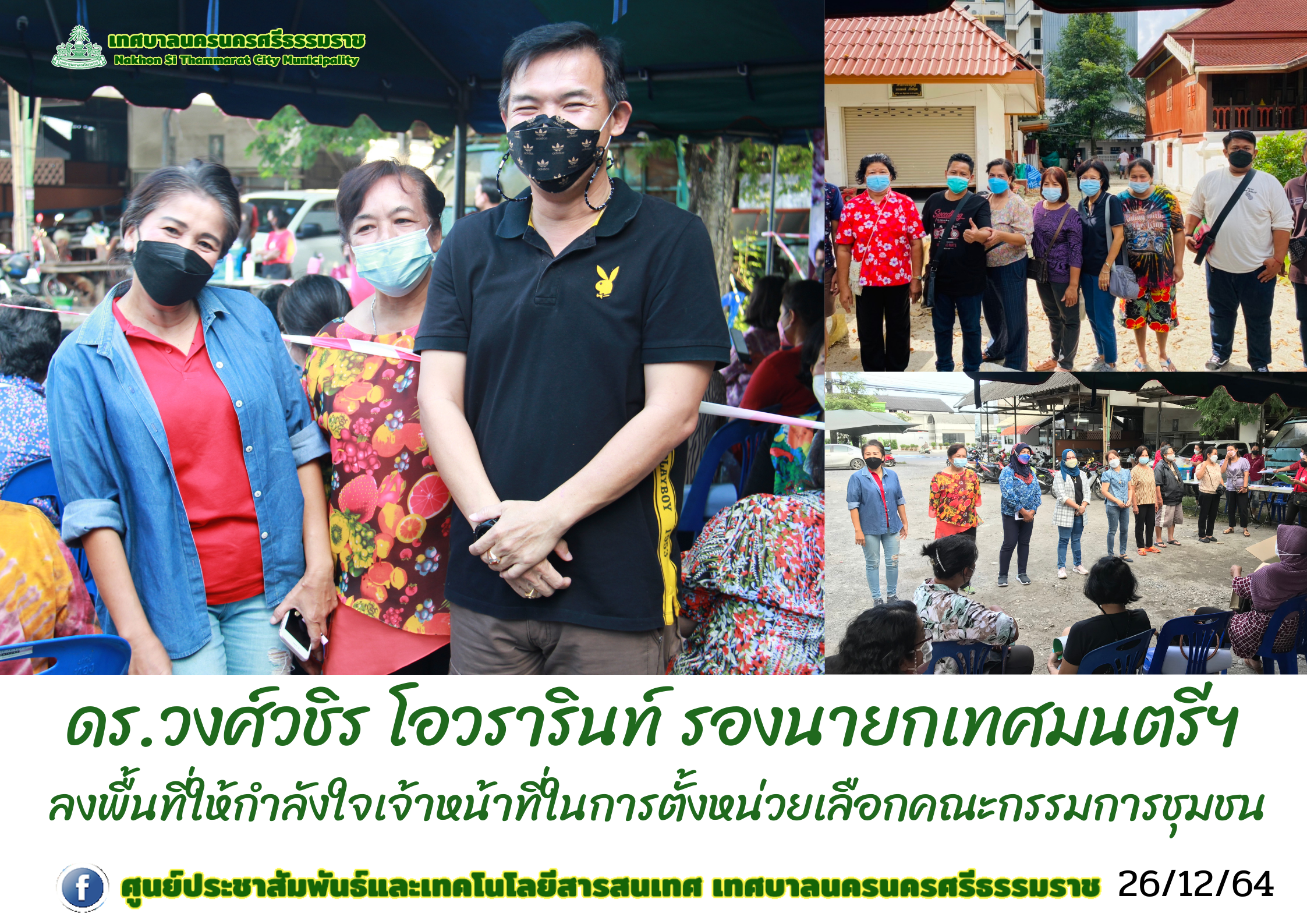 วันอาทิตย์ ที่ 26 ธันวาคม 2564 เวลา 09.00น. - 18.00 น. เทศบาลนครนครศรีธรรมราช โดยกองสวัสดิการสังคมดำเนินการตั้งหน่วยเลือกคณะกรรมการชุมชนเทศบาลนครนครศรีธรรมราช ณ ชุมชนหน้าทักษิณ และชุมชนเศรษฐีศรีนคร ทั้งนี้ ดร.วงศ์วชิร โอวรารินท์ รองนายกเทศมนตรีนครนครศรีธรรมราช พร้อมด้วย สมาชิกสภาเทศบาลนครนครศรีธรรมราชลงพื้นที่ให้กำลังใจเจ้าหน้าที่ในการดำเนินการเลือกคณะกรรมการชุมชนในครั้งนี้ |