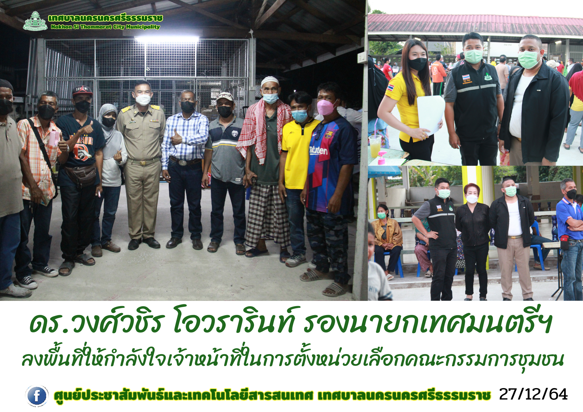 วันจันทร์ ที่ 27 ธันวาคม 2564 เวลา 16.00น. - 18.00 น. เทศบาลนครนครศรีธรรมราช โดยกองสวัสดิการสังคมดำเนินการตั้งหน่วยเลือกคณะกรรมการชุมชนเทศบาลนครนครศรีธรรมราช ณ ชุมชนทุ่งจีน ทั้งนี้ ดร.วงศ์วชิร โอวรารินท์ รองนายกเทศมนตรีนครนครศรีธรรมราช พร้อมด้วย สมาชิกสภาเทศบาลนครนครศรีธรรมราชลงพื้นที่ให้กำลังใจเจ้าหน้าที่ในการดำเนินการเลือกคณะกรรมการชุมชนในครั้งนี้ |