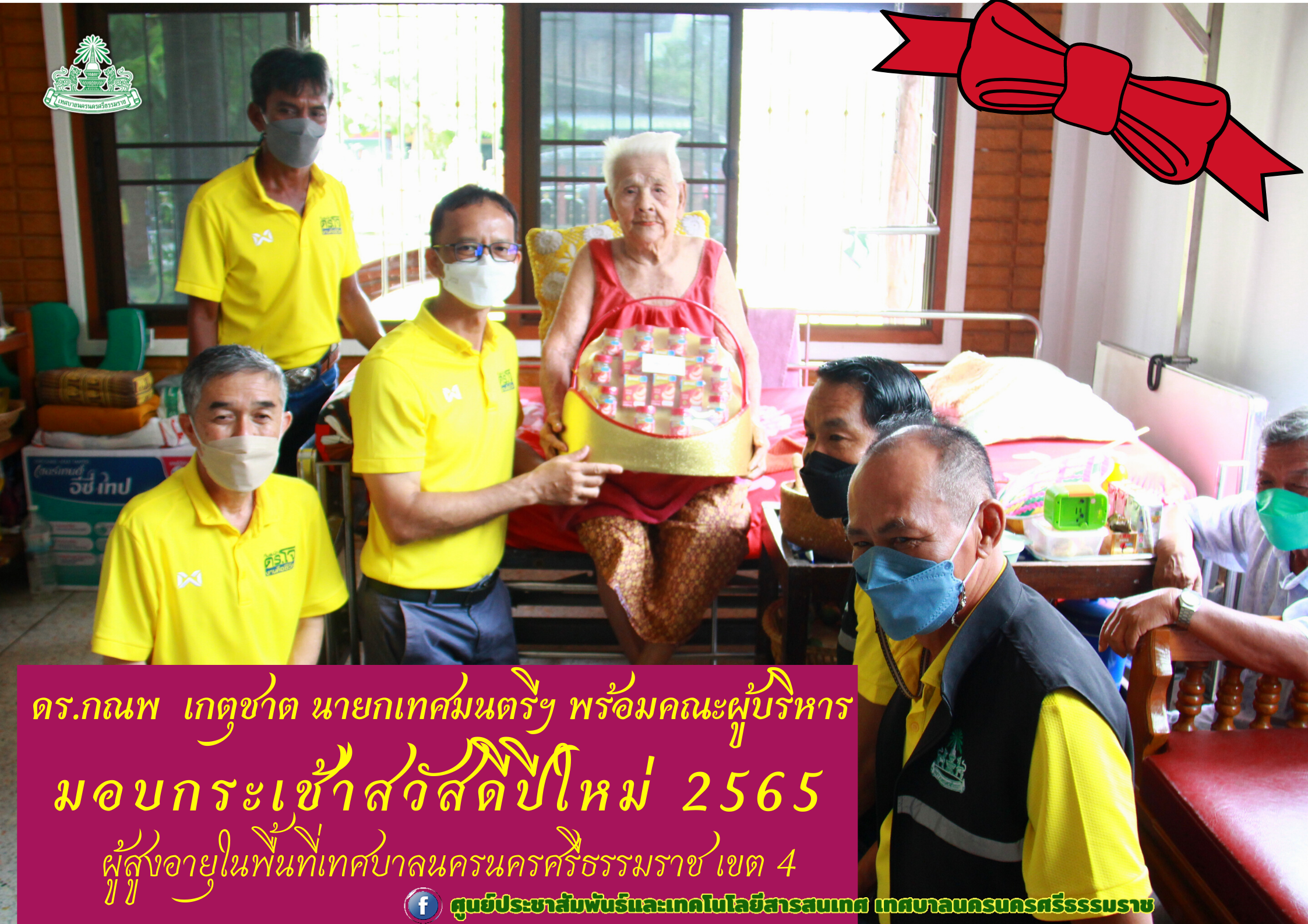 ดร.กณพ เกตุชาติ นายกเทศมนตรีนครนครศรีธรรมราช นำคณะผู้บริหาร สมาชิกสภาเทศบาลนครนครศรีธรรมราช ลงพื้นที่มอบกระเช้าสวัสดีปีใหม่ 2565 ผู้สูงอายุในเทศบาลนครนครศรีธรรมราช |