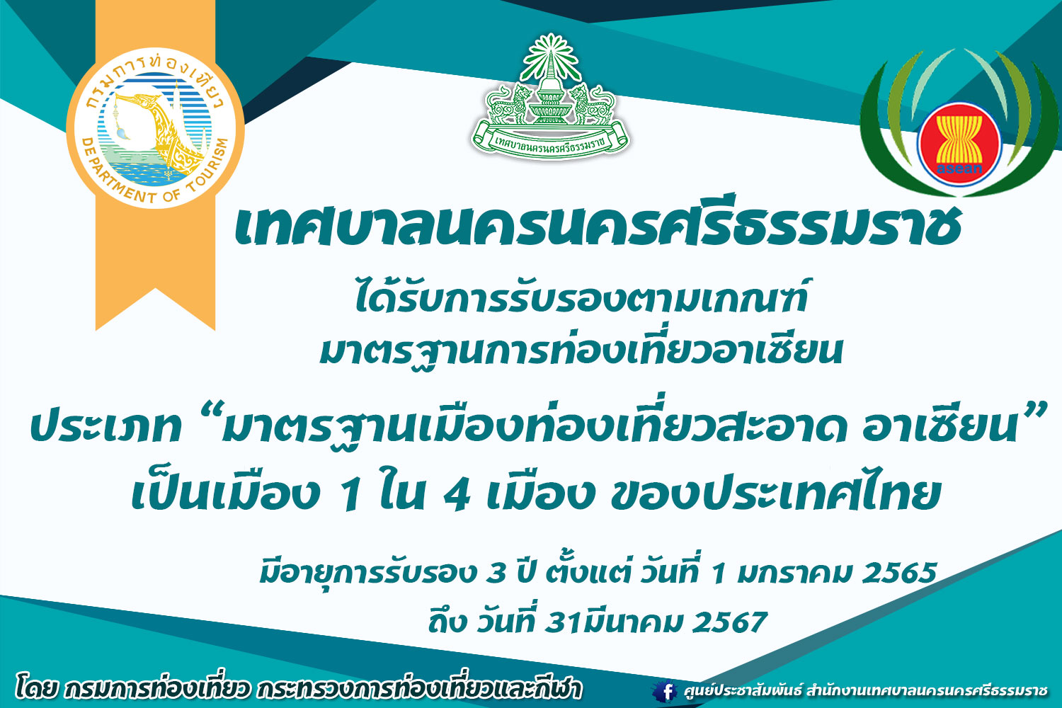ด้วยแผนยุทธศาสตร์ด้านการท่องเที่ยวอาเซียน ฉบับที่ 2 พ.ศ. 2559 ถึง 2568 อาเซียน (ASEAN Tourism Strategic Plan : ATSP 2016 - 2025 ) ได้กำหนดให้ประเทศสมาชิกอาเซียนดำเนินการ ตรวจประเมินและออกใบประกาศนียบัตรรับรองมาตรฐานให้แก่สถานประกอบการและชุมชนที่ผ่านการตรวจประเมินและได้รับการรับรองตามเกณฑ์มาตรฐานการท่องเที่ยวอาเซียนทุกมาตรฐาน ได้แก่ มาตรฐานโรงแรมสีเขียวอาเซียน มาตรฐานการบริการสปาอาเซียน มาตรฐานโฮมสเตย์อาเซียน มาตรฐานห้องน้ำสาธารณะอาเซียน มาตรฐานการท่องเที่ยวโดยชุมชนอาเซียน และมาตรฐานเมืองท่องเที่ยวสะอาดอาเซียน และกฎกระทรวงแบ่งส่วนราชการกรมการท่องเที่ยว กระทรวงการท่องเที่ยวและกีฬา พ.ศ. 2559 กำหนดให้กลุ่มการท่องเที่ยวมีภารกิจเกี่ยวกับการพัฒนาการท่องเที่ยว ในด้านบริการท่องเที่ยว โดยให้จัดทำมาตรฐานและกระบวนการตรวจประเมินและรับรองมาตรฐานบริการท่องเที่ยว และมาตรฐานเกี่ยวกับแหล่งท่องเที่ยว ประกอบกับคำสั่งกระทรวงการท่องเที่ยวและกีฬา ที่20/2564 แต่งตั้งคณะกรรมการตรวจประเมินและรับรองมาตรฐานการท่องเที่ยวอาเซียน ประจำปี พ.ศ. 2564 เพื่อดำเนินการตรวจประเมินและให้การรับรองสถานประกอบการให้เป็นไปตามมาตรฐานการท่องเที่ยวอาเซียน ทั้งนี้ เทศบาลนครนครศรีธรรมราช ได้ผ่านการประเมินรับการรับรองตามเกณฑ์มาตรฐานการท่องเที่ยวอาเซียนประเภทมาตรฐานเมืองท่องเที่ยวสะอาดอาเซียน เป็น 1 ใน 4 เมืองของประเทศไทยโดยมีอายุการรับรอง 3 ปี ตั้งแต่วันที่ 1 มกราคม 2565 ถึงวันที่ 31 มีนาคม 2567