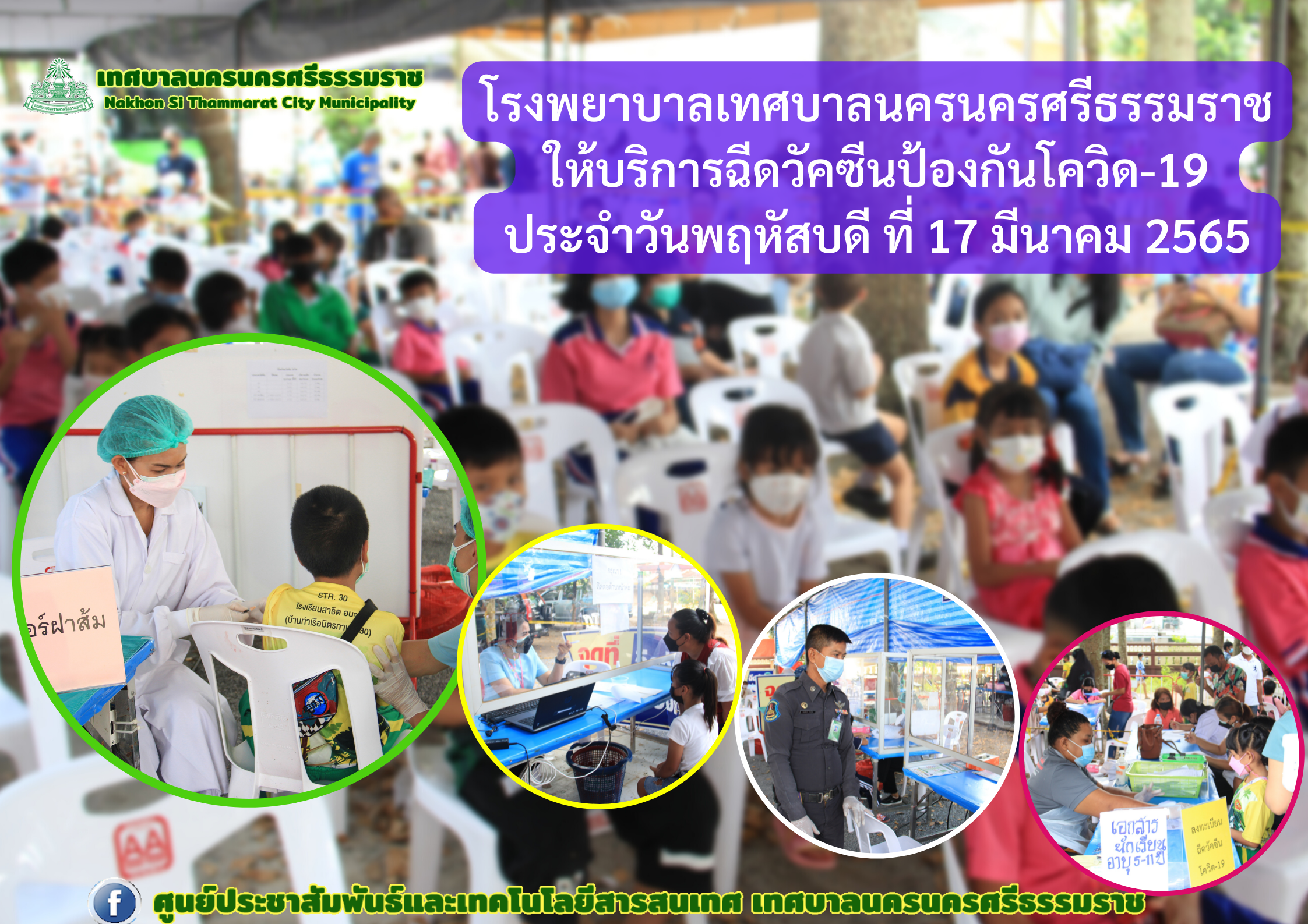 วันพฤกัสบดี ที่ 17 มีนาคม พ.ศ. 2565 เวลา 08.30 น. ณ ศูนย์ฉีดวัคซีน วัดสวนป่าน ดร.กณพ เกตุชาติ นายกเทศมนตรีนคjoiรนครศรีธรรมราช มอบหมายให้กองการแพทย์โรงพยาบาลเทศบาลนครนครศรีธรรมราช ดำเนินการฉีดวัคซีนป้องกันโควิด-19 สำหรับนักเรียน อายุ 5-11 ปี ของโรงเรียนเทศบาลวัดศาลามีชัย โรงเรียนสิทธาภัทร โรงเรียนสาธิตอวค์การบริหารส่วนจังหวัดนครศรีธรรมราช และโรงเรียนมุสลิมสันติธรรม จำนวน 287คน ทั้งนี้ สามารถสอบถามเพิ่มเติมได้ที่ 075-356014 ต่อ 0 หรือ 088-2620737, 088-2620738 ในวันและเวลาราชการ ตั้งแต่เวลา 08.30 น.-15.30 น.