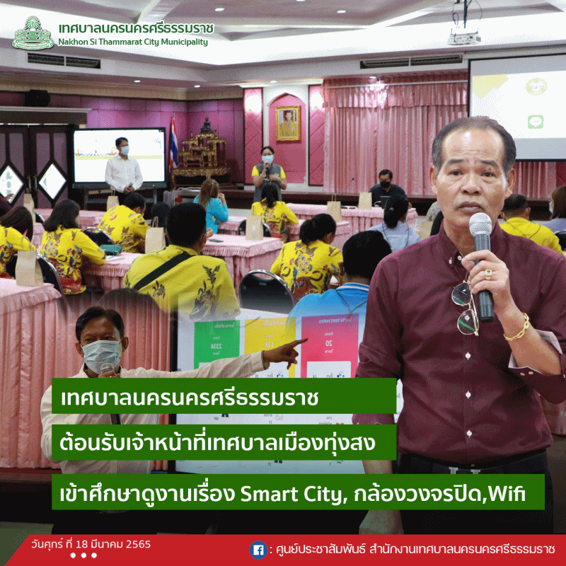 วันศุกร์ ที่18 มีนาคม 2565 เวลา 08.30-16.30 น. นายชาคร ไอยศูรย์ ปลัดเทศบาล ได้ต้อนรับเจ้าหน้าที่เทศบาลเมืองทุ่งสงเข้าศึกษาดูงานเรื่อง Smart City, กล้องวงจรปิด,Wifi ของกองยุทธศาสตร์และงบประมาณ ซึ่งในวันนี้มีคณะศึกษาดูงานจากเทศบาลเมืองทุ่งสง จำนวน 25 คน ณ ห้องประชุมสำนักงานเทศบาลนครนครศรีธรรมราช (ชั้น5) การศึกษาดูงานในครั้งนี้ เพื่อนำไปปรับใช้ด้านเทคโนโลยีต่อไป .............. ภาพ//ไกรสิทธิ ข่าว//จันทร์จิรา อินโฟ//วิศรุษ |
