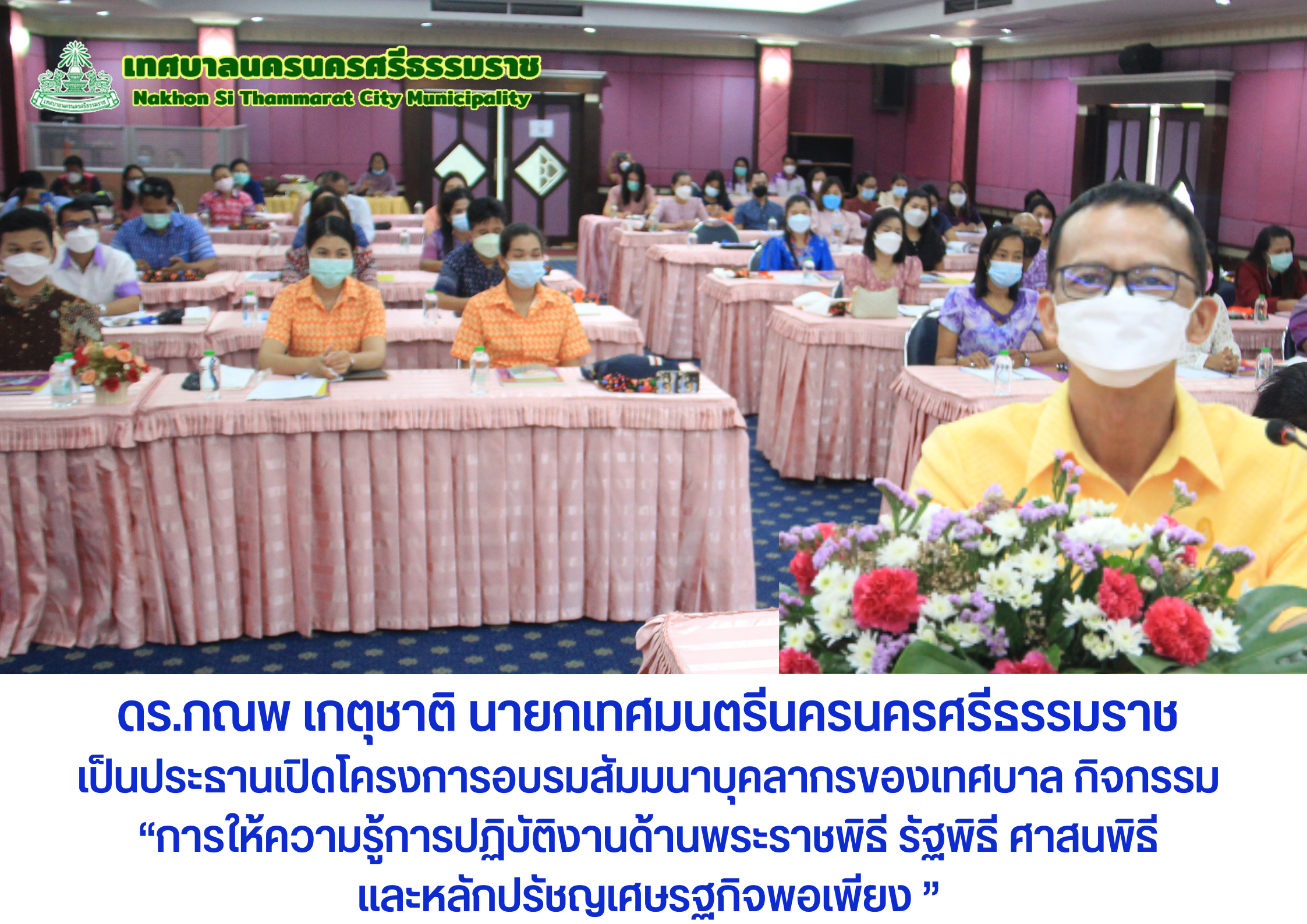 วันอังคาร ที่ 31 พฤษภาคม 2565 เวลา 08.30 น. ณ ห้องประชุมชั้น 5 สำนักงานเทศบาลนครนครศรีธรรมราช ดร.กณพ เกตุชาติ นายกเทศมนตรีนครนครศรีธรรมราช เป็นประธานเปิด โครงการอบรมสัมมนาบุคลากรของเทศบาล กิจกรรม “การให้ความรู้การปฏิบัติงานด้านพระราชพิธี รัฐพิธี ศาสนพิธี และหลักปรัชญเศษรฐกิจพอเพียง ” เพื่อเป็นการแสดงความจงรักภักดีเทิดทูนและรำลึกถีงพระมหากษัตริย์ สร้างความรู้ ความเข้าใจและหลักปฏิบัติเกี่ยวกับการจัดงาน พระราชพิธี รัฐพิธี และศาสนา ที่ถูกต้องและมีความเหมาะสมและเพื่อเป็นการสร้างความรู้ ความเข้าใจเกี่ยวกับหลักปรัชญาหลักเศรษฐกิจพอเพียงสามารถนำมาปรับใช้กับการปฏิบัติงานได้ โดยมีผู้เข้าร่วมอบรม จำนวน 45 คน ได้รับเกียรติจากเจ้าหน้าที่จากสำนักงานวัฒนธรรมจังหวัดนครศรีธรรมราช เป็นคณะวิทยากรให้ความรู้ในครั้งนี้