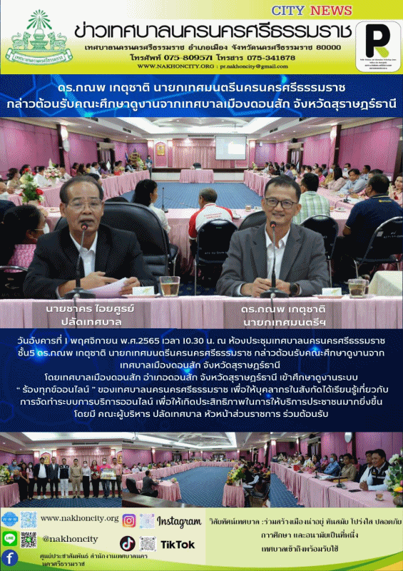 วันอังคารที่ 1 พฤศจิกายน พ.ศ.2565 เวลา 10.30 น. ณ ห้องประชุมเทศบาลนครนครศรีธรรมราช ชั้น5 ดร.กณพ เกตุชาติ นายกเทศมนตรีนครนครศรีธรรมราช กล่าวต้อนรับคณะศึกษาดูงานจากเทศบาลเมืองดอนสัก จังหวัดสุราษฎร์ธานี