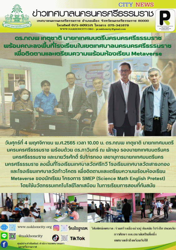 ดร.กณพ เกตุชาติ นายกเทศมนตรีนครนครศรีธรรมราช พร้อมคณะลงพื้นที่โรงเรียนในเขตเทศบาลนครนครศรีธรรมราช เพื่อติดตามและเตรียมความพร้อมห้องเรียน Metaverse |