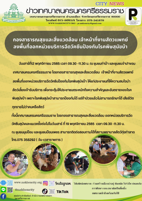 วันเสาร์ที่12 พฤศจิกายน 2565 เวลา 09.30 -11.30 น. ณ ชุมชนท่าม้า และชุมชนจำปาขอม เทศบาลนครนครศรีธรรมราช โดยกองสาธารณสุขและสิ่งแวดล้อม เจ้าหน้าที่งานสัตวแพทย์ ลงพื้นที่ออกหน่วยบริการฉีดวัคซีนป้องกันโรคพิษสุนัขบ้า ให้แก่ประชาชนที่ให้ความสนใจนำสัตว์เลี้ยงเข้ารับบริการ เพื่อกระตุ้นให้ประชาชนตระหนักถึงความสำคัญและอันตรายของโรคพิษสุนัขบ้า เพราะโรคพิษสุนัขบ้าสามารถป้องกันได้ แต่ถ้าป่วยแล้วไม่สามารถรักษาได้ เสียชีวิตทุกรายไม่ว่าคนหรือสัตว์ ซึ่งในวันนี้มีประชาชนทยอยนำสัตว์เลี้ยง สุนัขและแมว มาลงทะเบียนแจ้งชื่อ อายุของสัตว์เลี้ยงรับบริการฉีดวัคซีนป้องกันโรคพิษสุนัขบ้า รับใบรับรองและป้ายโลหะไปคล้องคอสัตว์เลี้ยง ทั้งนี้เทศบาลนครนครศรีธรรมราช โดยกองสาธารณสุขและสิ่งแวดล้อม ออกหน่วยบริการฉีดวัคซีนสุนัขและแมวครั้งต่อไปในวันเสาร์ ที่ 19 พฤศจิกายน 2565 เวลา 09.30 -11.30 น. ณ ชุมชนมุมป้อม และชุมชนป้อมเพชร สามารถติดต่อสอบถามได้ที่สถานพยาบาลสัตว์ทุ่งท่าลาด โทร.075 358292 ( วัน-เวลาราชการ ) ................... ภาพ//ข่าว//จันทร์จิรา |