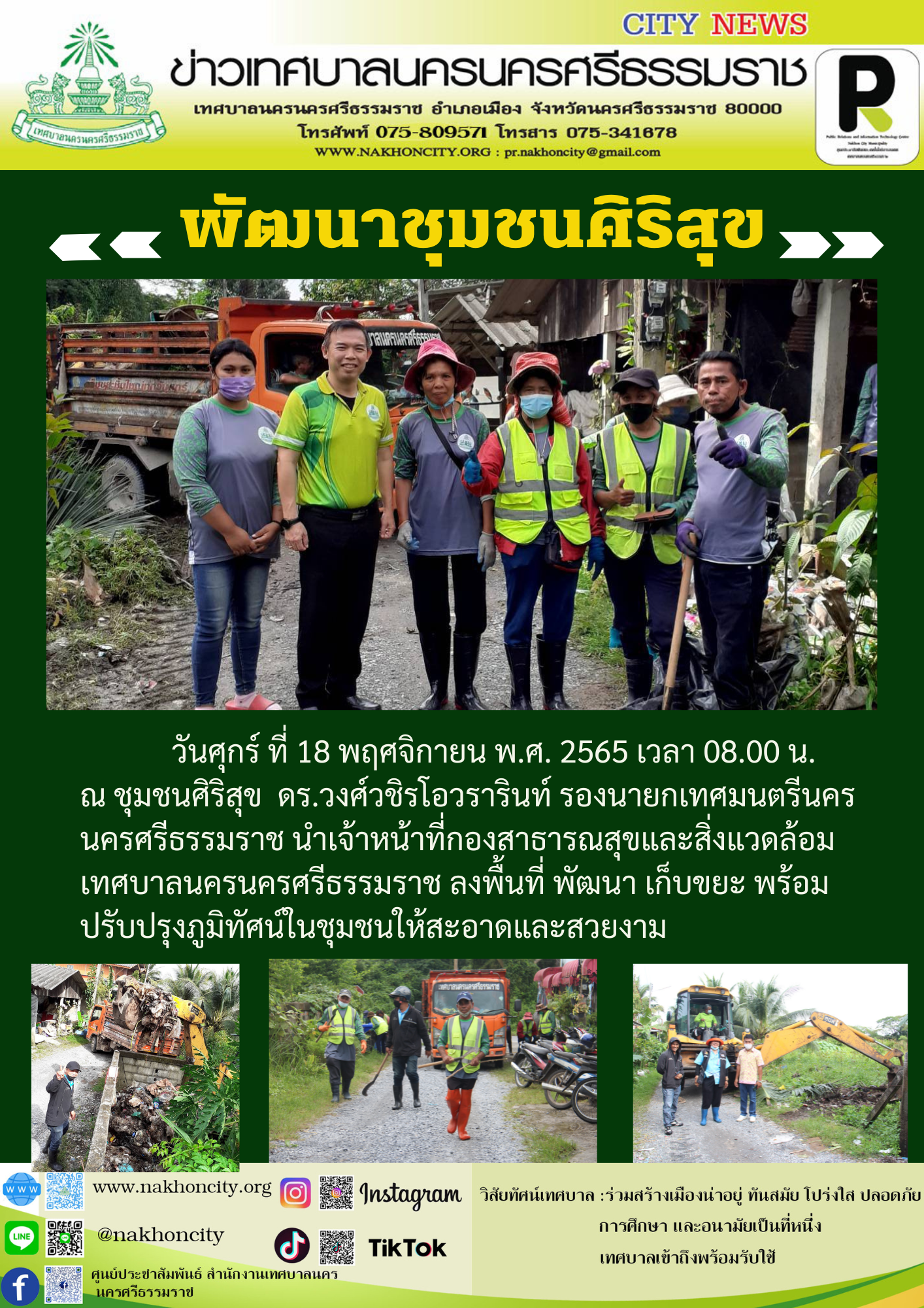 วันศุกร์ ที่ 18 พฤศจิกายน พ.ศ. 2565 เวลา 08.00 น. ณ ชุมชนศิริสุข ดร.วงศ์วชิร โอวรารินท์ รองนายกเทศมนตรีนครนครศรีธรรมราช นำเจ้าหน้าที่กองสาธารณสุขและสิ่งแวดล้อม เทศบาลนครนครศรีธรรมราช ลงพื้นที่ พัฒนา เก็บขยะ พร้อมปรับปรุงภูมิทัศน์ในชุมชนให้สะอาดและสวยงาม