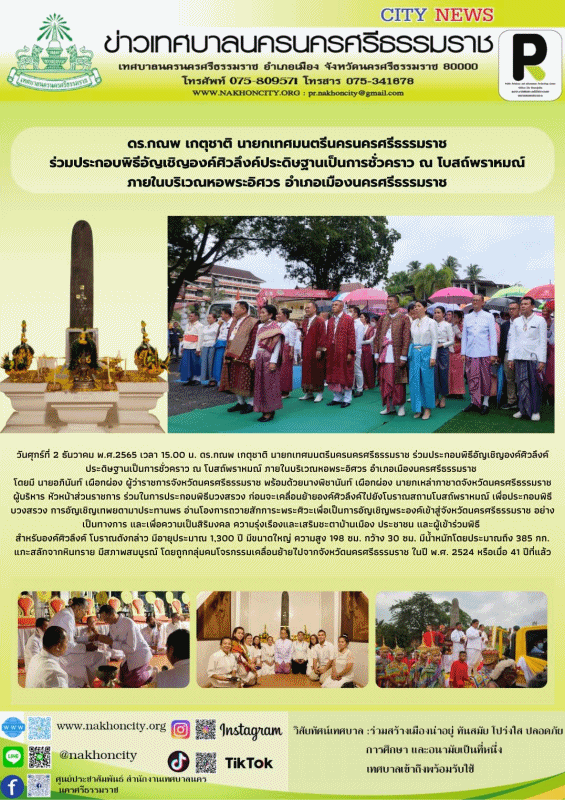 ดร.กณพ เกตุชาติ นายกเทศมนตรีนครนครศรีธรรมราช ร่วมประกอบพิธีอัญเชิญองค์ศิวลึงค์ประดิษฐานเป็นการชั่วคราว ณ โบสถ์พราหมณ์ ภายในบริเวณหอพระอิศวร อำเภอเมืองนครศรีธรรมราช |