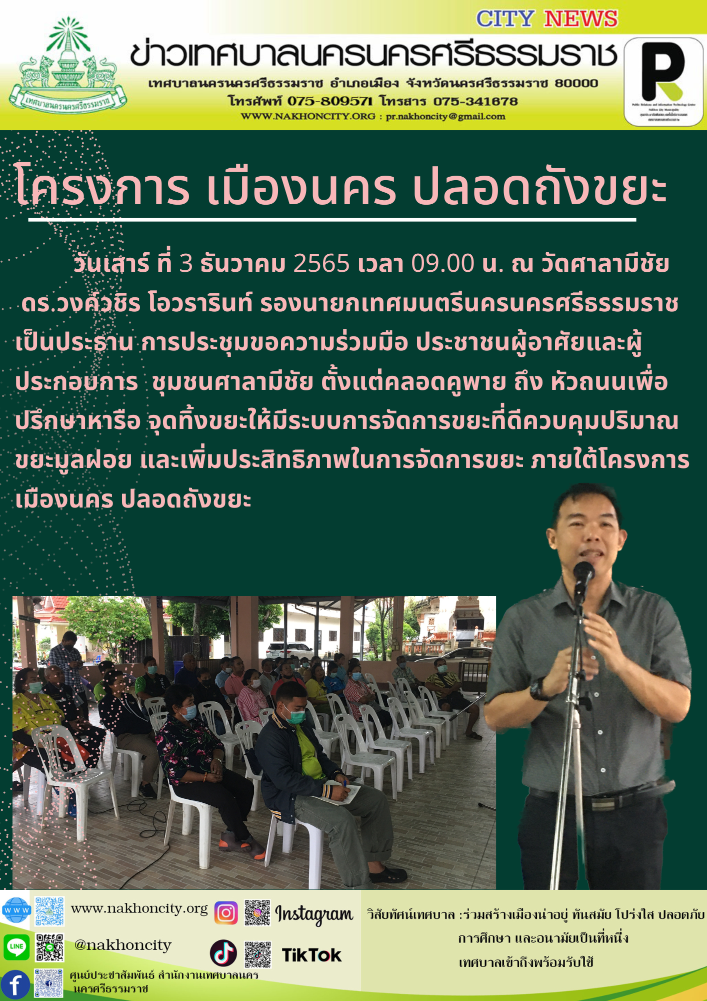 วันเสาร์ ที่ 3 ธันวาคม 2565 เวลา 09.00 น. ณ วัดศาลามีชัย ดร.วงค์วชิร โอวรารินท์ รองนายกเทศมนตรีนครนครศรีธรรมราช เป็นประธาน การประชุมขอความร่วมมือ ประชาชนผู้อาศัยและผู้ประกอบการ ชุมชนศาลามีชัย ตั้งแต่คลอดคูพาย ถึง หัวถนนเพื่อปรึกษาหารือ จุดทิ้งขยะให้มีระบบการจัดการขยะที่ดีควบคุมปริมาณขยะมูลฝอย และเพิ่มประสิทธิภาพในการจัดการขยะ ภายใต้โครงการ เมืองนคร ปลอดถังขยะ |