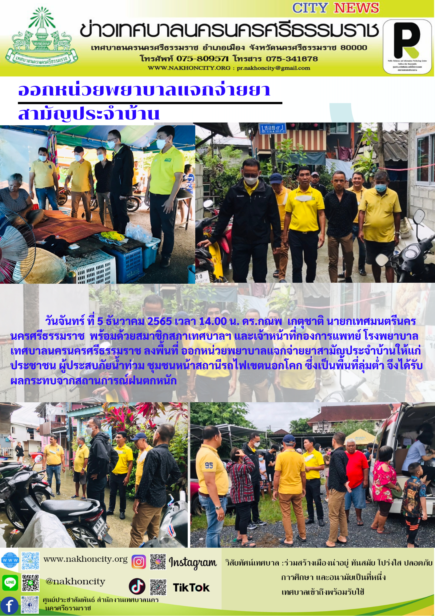 วันจันทร์ ที่ 5 ธันวาคม 2565 เวลา 14.00 น. ดร.กณพ เกตุชาติ นายกเทศมนตรีนครนครศรีธรรมราช พร้อมด้วยสมาชิกสภาเทศบาลฯ เจ้าหน้าที่กองการแพทย์ โรงพยาบาลเทศบาลนครนครศรีธรรมราช ลงพื้นที่ ออกหน่วยพยาบาลแจกจ่ายยาสามัญประจำบ้านให้แก่ประชาชน ผู้ประสบภัยน้ำท่วม ชุมชนหน้าสถานีรถไฟเขตนอกโคก ซึ่งเป็นพื้นที่ลุ่มต่ำ จึงได้รับผลกระทบจากสถานการณ์ฝนตกหนัก |