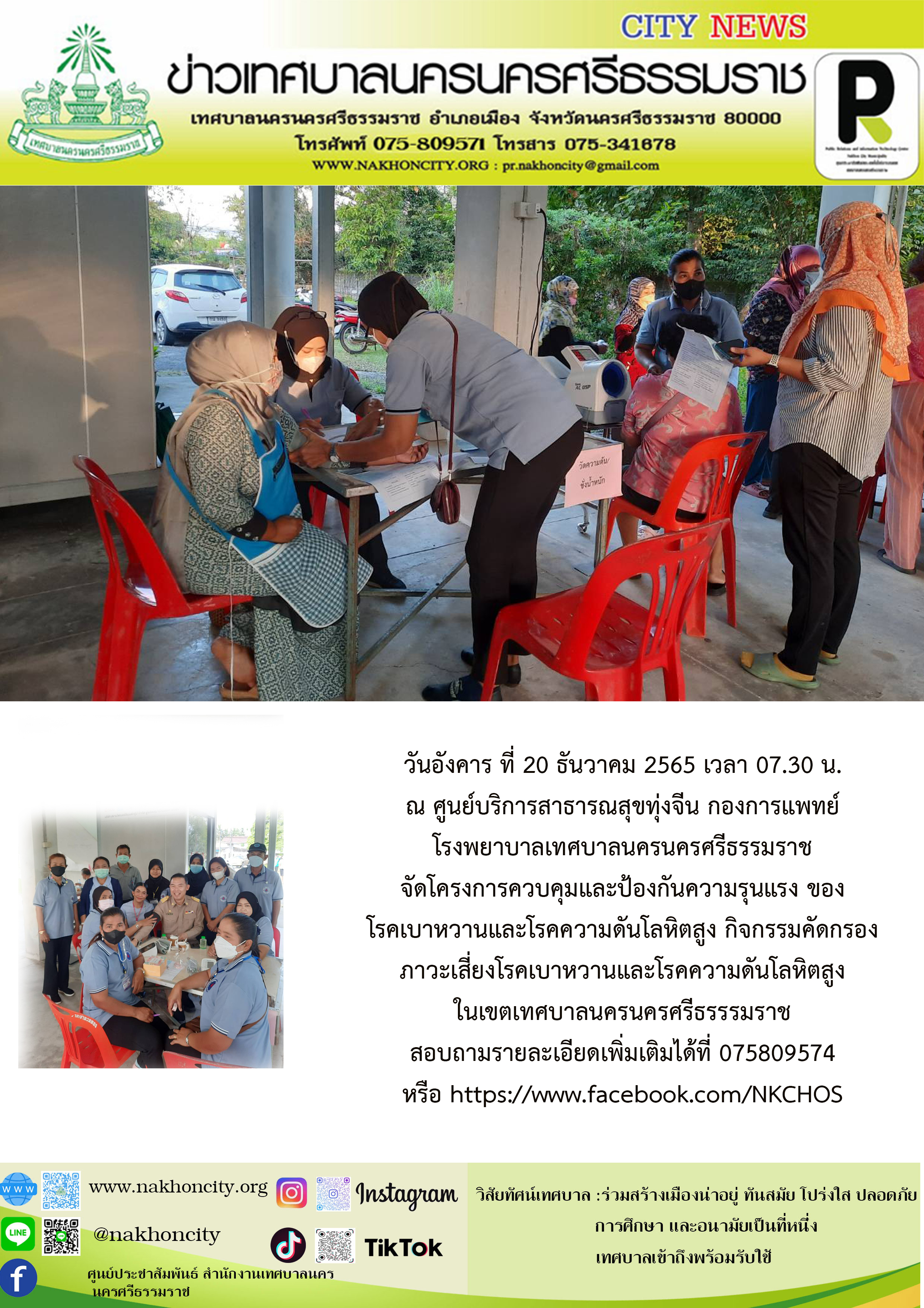 วันอังคาร ที่ 20 ธันวาคม 2565 เวลา 07.30 น. ณ ศูนย์บริการสาธารณสุขทุ่งจีน กองการแพทย์ โรงพยาบาลเทศบาลนครนครศรีธรรมราช จัดโครงการควบคุมและป้องกันความรุนแรงของโรคเบาหวานและโรคความดันโลหิตสูง กิจกรรมคัดกรองภาวะเสี่ยงโรคเบาหวานและโรคความดันโลหิตสูงในเขตเทศบาลนครนครศรีธรรรมราช สอบถามรายละเอียดเพิ่มเติมได้ที่ 075809574 หรือ https://www.facebook.com/NKCHOS
