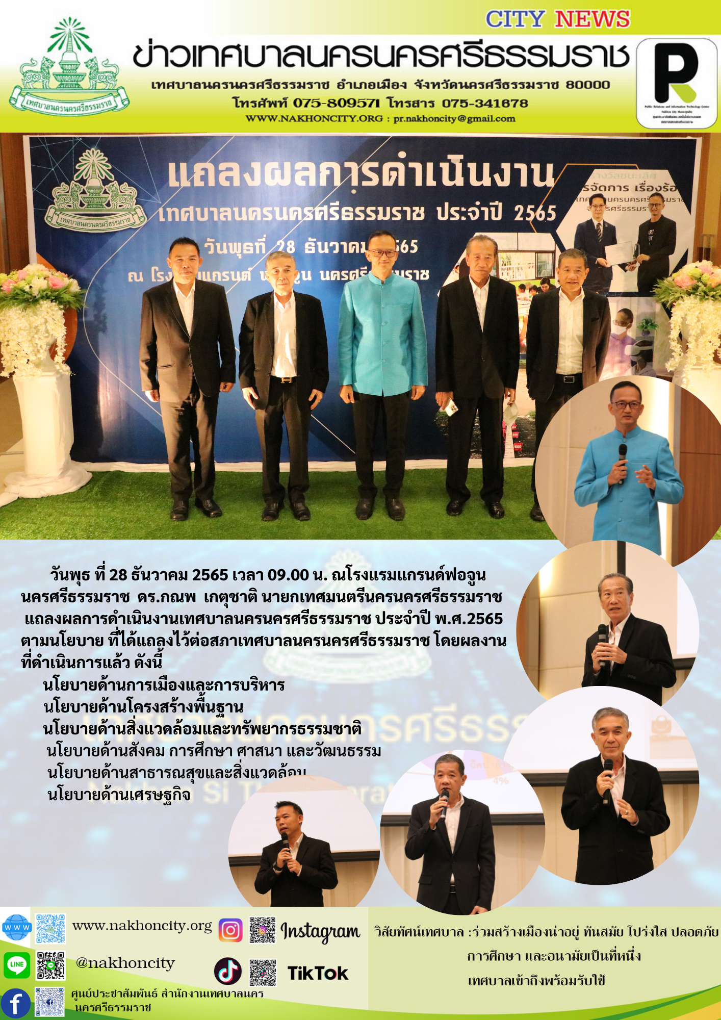 วันพุธ ที่ 28 ธันวาคม 2565 เวลา 09.00 น. ณ โรงแรมแกรนด์ฟอจูน นครศรีธรรมราช ดร.กณพ เกตุชาติ นายกเทศมนตรีนครนครศรีธรรมราช แถลงผลการดำเนินงานเทศบาลนครนครศรีธรรมราช ประจำปี พ.ศ.2565 ตามนโยบาย ที่ได้แถลงไว้ต่อสภาเทศบาลนครนครศรีธรรมราช โดยผลงานที่ดำเนินการแล้ว ดังนี้ นโยบายด้านการเมืองและการบริหาร