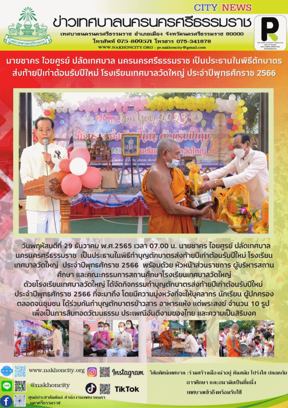 นายชาคร ไอยศูรย์ ปลัดเทศบาล นครนครศรีธรรมราช เป็นประธานในพิธีตักบาตรส่งท้ายปีเก่าต้อนรับปีใหม่ โรงเรียนเทศบาลวัดใหญ่ ประจำปีพุทธศักราช 2566 |