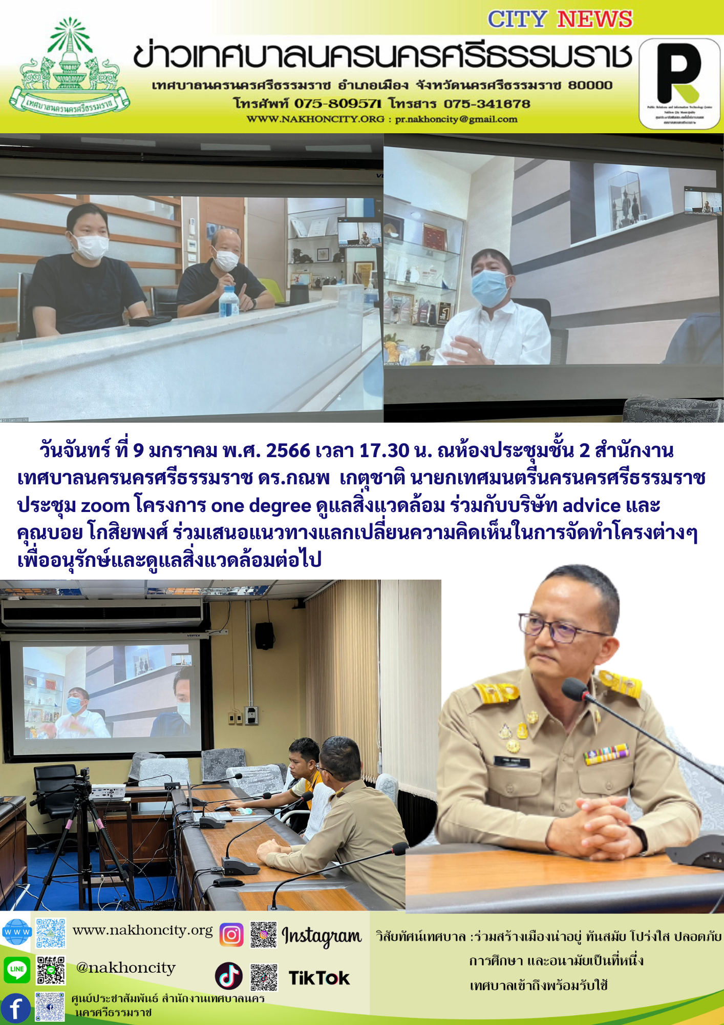 วันจันทร์ ที่ 9 มกราคม พ.ศ. 2566 เวลา 17.30 น. ณห้องประชุมชั้น 2 สำนักงานเทศบาลนครนครศรีธรรมราช ดร.กณพ เกตุชาติ นายกเทศมนตรีนครนครศรีธรรมราช ประชุม zoom โครงการ one degree ดูแลสิ่งแวดล้อม ร่วมกับบริษัท advice และ คุณบอย โกสิยพงศ์ ร่วมเสนอแนวทางแลกเปลี่ยนความคิดเห็นในการจัดทำโครงต่างๆ เพื่ออนุรักษ์และดูแลสิ่งแวดล้อมต่อไป |