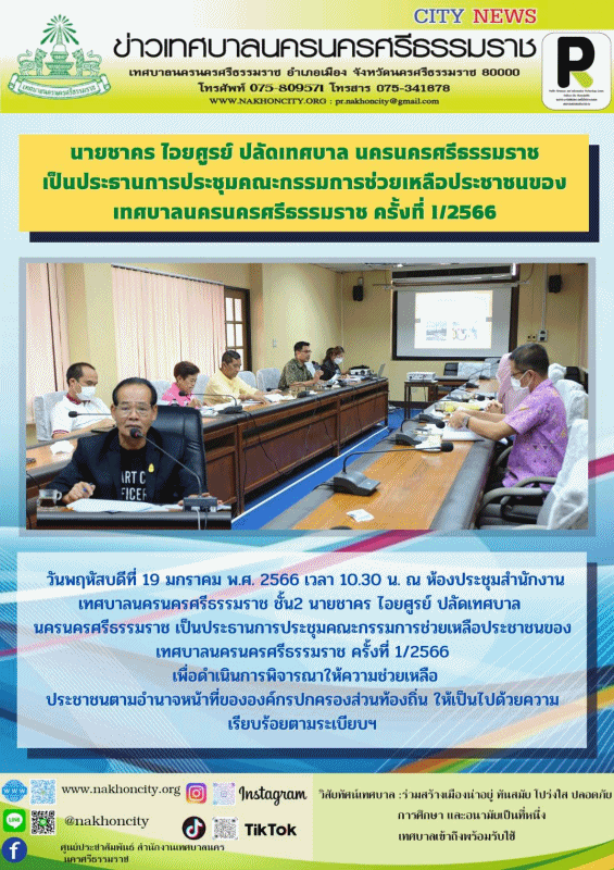 นายชาคร ไอยศูรย์ ปลัดเทศบาล นครนครศรีธรรมราช เป็นประธานการประชุมคณะกรรมการช่วยเหลือประชาชนของเทศบาลนครนครศรีธรรมราช ครั้งที่ 1/2566 |