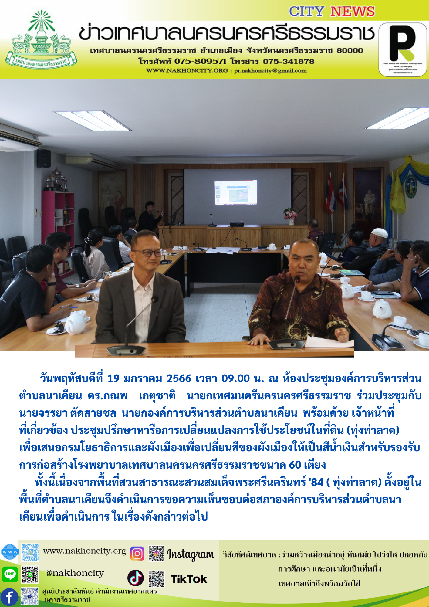 ดร.กณพ เกตุชาติ นายกเทศมนตรีนครนครศรีธรรมราช ร่วมประชุมกับ นายจรรยา ตัดสายชล นายกองค์การบริหารส่วนตำบลนาเคียน พร้อมด้วย เจ้าหน้าที่ที่เกี่ยวข้อง ประชุมปรึกษาหารือการเปลี่ยนแปลงการใช้ประโยชน์ในที่ดิน ( ทุ่งท่าลาด) |