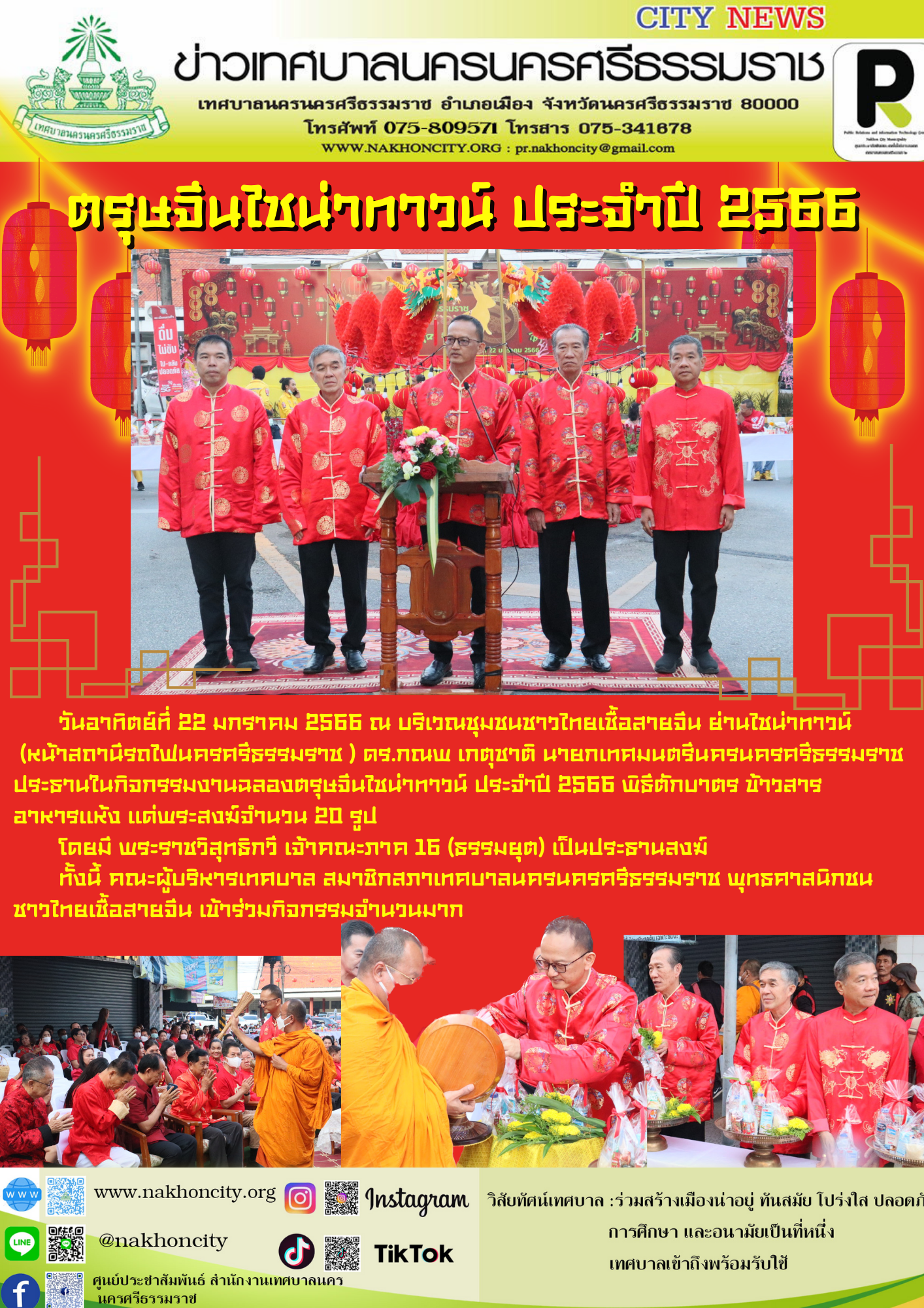วันอาทิตย์ที่ 22 มกราคม 2566 ณ บริเวณชุมชนชาวไทยเชื้อสายจีน ย่านไชน่าทาวน์ (หน้าสถานีรถไฟนครศรีธรรมราช ) ดร.กณพ เกตุชาติ นายกเทศมนตรีนครนครศรีธรรมราช ประธานในกิจกรรมงานฉลองตรุษจีนไชน่าทาวน์ ประจำปี 2566 พิธีตักบาตร ข้าวสาร อาหารแห้ง แด่พระสงฆ์จำนวน 20 รูป โดยมี พระราชวิสุทธิกวี เจ้าคณะภาค 16 (ธรรมยุต) เป็นประธานสงฆ์ ทั้งนี้ คณะผู้บริหารเทศบาล สมาชิกสภาเทศบาลนครนครศรีธรรมราช พุทธศาสนิกชน ชาวไทยเชื้อสายจีน เข้าร่วมกิจกรรมจำนวนมาก |