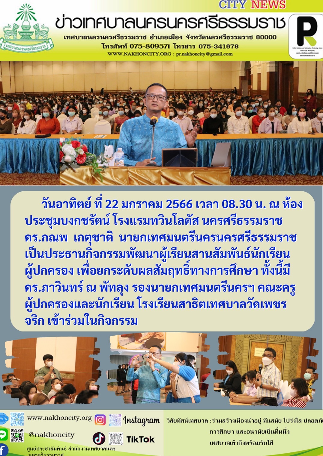 วันอาทิตย์ ที่ 22 มกราคม 2566 เวลา 08.30 น. ณ ห้องประชุมบงกชรัตน์ โรงแรมทวินโลตัส นครศรีธรรมราช ดร.กณพ เกตุชาติ นายกเทศมนตรีนครนครศรีธรรมราช เป็นประธานกิจกรรมพัฒนาผู้เรียนสานสัมพันธ์นักเรียน ผู้ปกครอง เพื่อยกระดับผลสัมฤทธิ์ทางการศึกษา ทั้งนี้มีดร.ภาวินทร์ ณ พัทลุง รองนายกเทศมนตรีนครนครศรีธรรมราช คณะครู ผู้ปกครองและนักเรียน โรงเรียนสาธิตเทศบาลวัดเพชรจริก เข้าร่วมในกิจกรรม