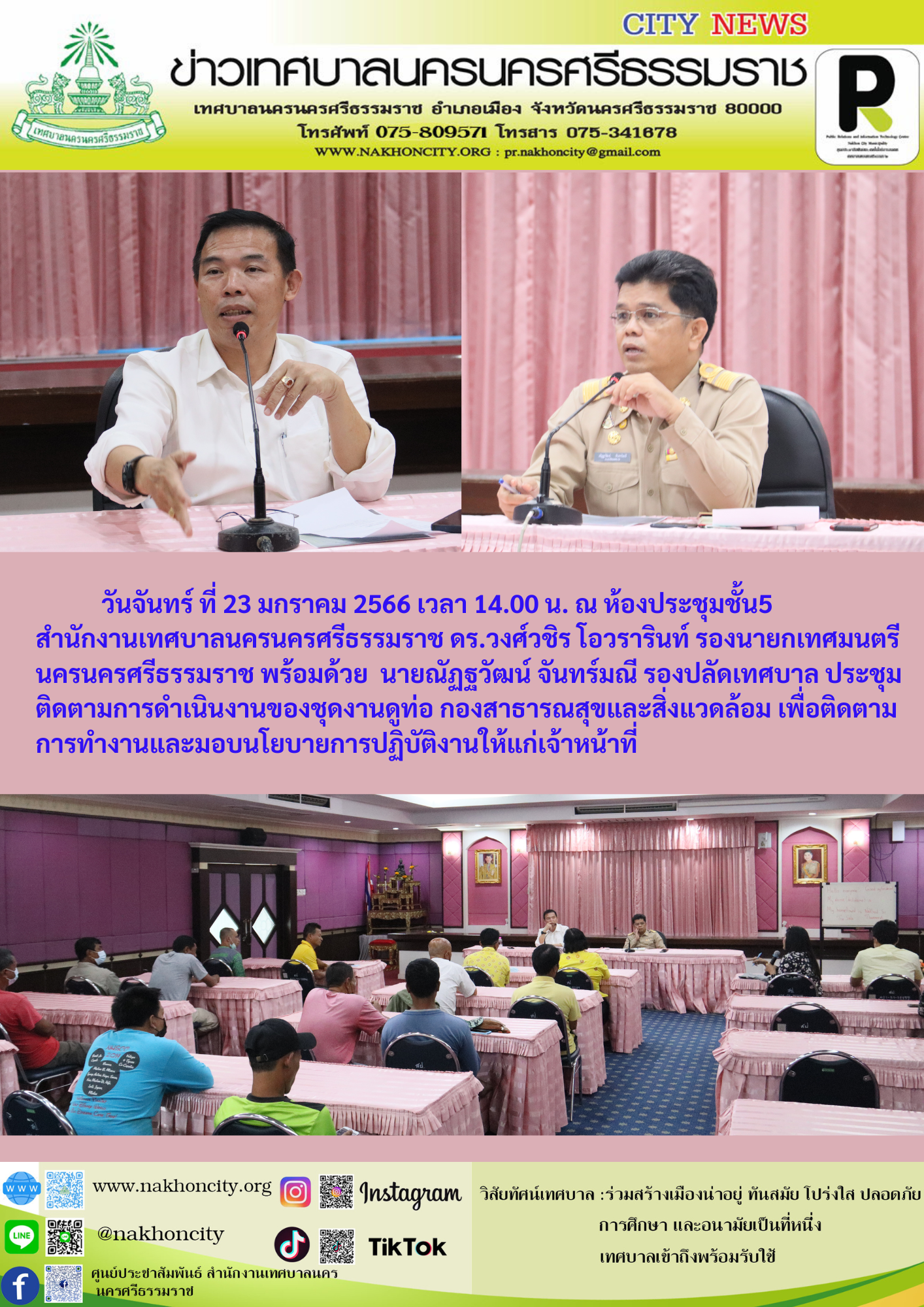 วันจันทร์ ที่ 23 มกราคม 2566 เวลา 14.00 น. ณ ห้องประชุมชั้น5 สำนักงานเทศบาลนครนครศรีธรรมราช ดร.วงศ์วชิร โอวรารินท์ รองนายกเทศมนตรีนครนครศรีธรรมราช พร้อมด้วย นายณัฏฐวัฒน์ จันทร์มณี รองปลัดเทศบาล ประชุมติดตามการดำเนินงานของชุดงานดูท่อ กองสาธารณสุขและสิ่งแวดล้อม เพื่อติดตามการทำงานและมอบนโยบายการปฏิบัติงานให้แก่เจ้าหน้าที่ |