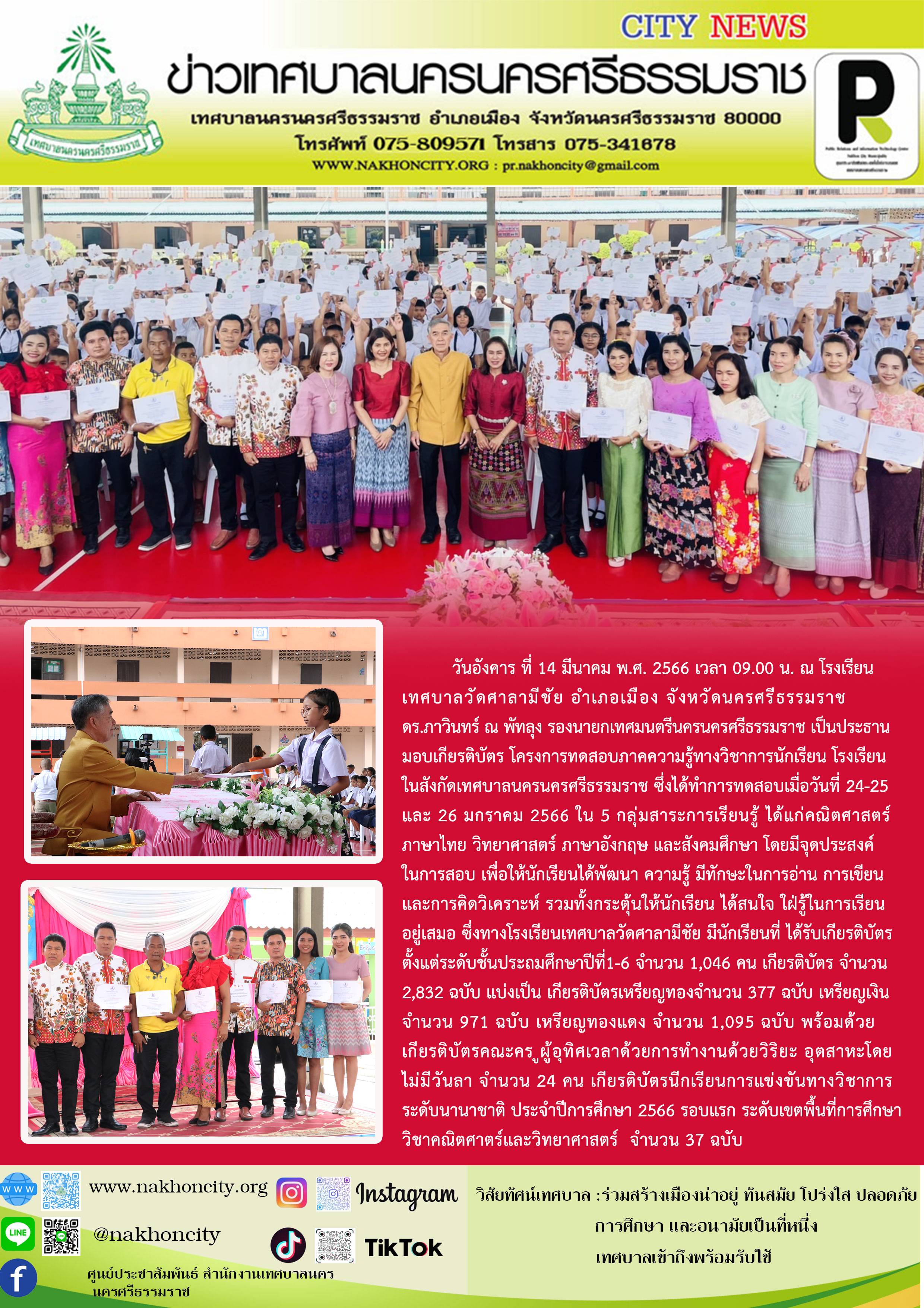 วันอังคาร ที่ 14 มีนาคม พ.ศ. 2566 เวลา 09.00 น. ณ โรงเรียนเทศบาลวัดศาลามีชัย ดร.ภาวินทร์ ณ พัทลุง รองนายกเทศมนตรีนครนครศรีธรรมราช เป็นประธานมอบเกียรติบัตรโครงการทดสอบภาคความรู้ทางวิชาการนักเรียน โรงเรียนในสังกัดเทศบาลนครนครศรีธรรมราช ซึ่งได้ทำการทดสอบเมื่อวันที่ 24-25 และ 26 มกราคม 2566 ใน 5 กลุ่มสาระการเรียนรู้ ได้แก่คณิตศาสตร์ ภาษาไทย วิทยาศาสตร์ ภาษาอังกฤษ และสังคมศึกษา โดยมีจุดประสงค์ในการสอบเพื่อให้นักเรียนได้พัฒนาความรู้ มีทักษะในการอ่าน การเขียนและการคิดวิเคราะห์ รวมทั้งกระตุ้นให้นักเรียนได้สนใจ ใฝ่รู้ในการเรียนอยู่เสมอ ซึ่งทางโรงเรียนเทศบาลวัดศาลามีชัย มีนักเรียนที่ได้รับเกียรติบัตร ตั้งแต่ระดับชั้นประถมศึกษาปีที่1-6 จำนวน 1,046 คน เกียรติบัตร จำนวน 2,832 ฉบับ แบ่งเป็น เกียรติบัตรเหรียญทองจำนวน 377 ฉบับ เหรียญเงิน จำนวน 971 ฉบับ เหรียญทองแดง จำนวน 1,095 ฉบับ พร้อมด้วยเกียรติบัตรคณะครูผู้อุทิศเวลาด้วยการทำงานด้วยวิริยะ อุตสาหะโดยไม่มีวันลา จำนวน 24 คน เกียรติบัตรนีกเรียนการแข่งขันทางวิชาการระดับนานาชาติ ประจำปีการศึกษา 2566 รอบแรก ระดับเขตพื้นที่การศึกษา วิชาคณิตศาตร์และวิทยาศาสตร์ จำนวน 37 ฉบับ