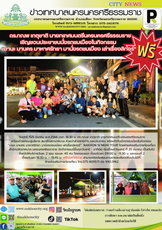 ดร.กณพ เกตุชาติ นายกเทศมนตรีนครนครศรีธรรมราช เชิญชวนประชาชนนั่งรถชมเมืองในกิจกรรม “มานะ มานคร มาหาศรัทธา มานั่งรถชมเมือง เล่าเรื่องลิกอร์” |