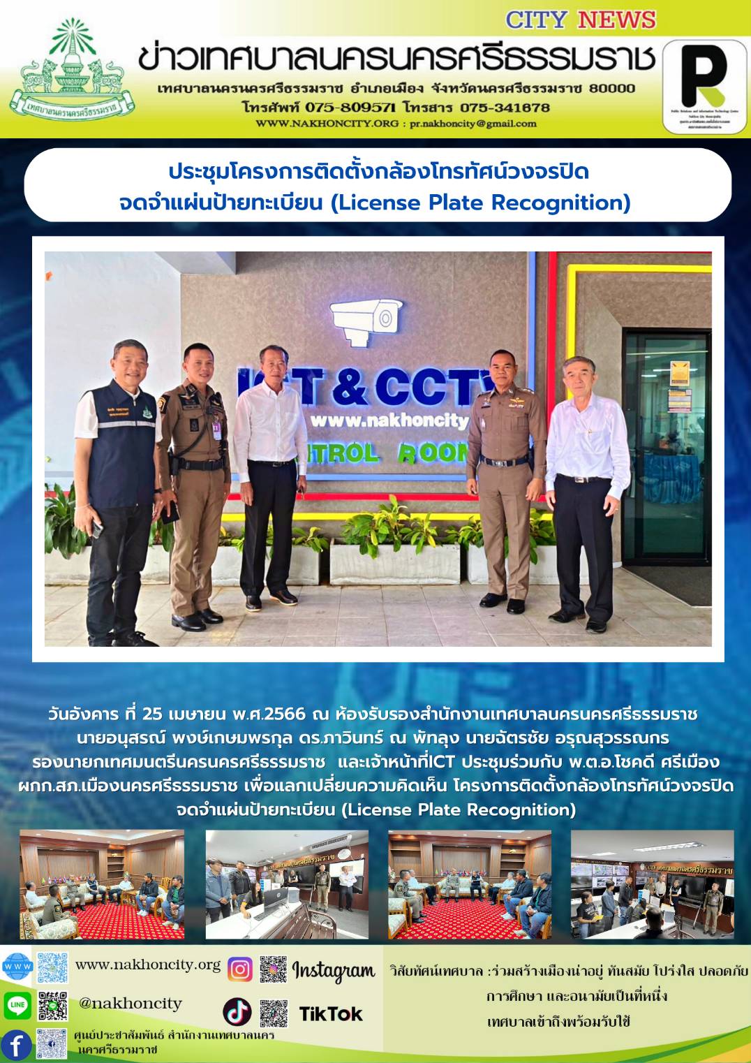 วันอังคาร ที่ 25 เมษายน พ.ศ.2566 ณ ห้องรับรองสำนักงานเทศบาลนครนครศรีธรรมราช นายอนุสรณ์ พงษ์เกษมพรกุล ดร.ภาวินทร์ ณ พัทลุง นายฉัตรชัย อรุณสุวรรณกร รองนายกเทศมนตรีนครนครศรีธรรมราช และเจ้าหน้าที่ICT ประชุมร่วมกับ พ.ต.อ.โชคดี ศรีเมือง ผกก.สภ.เมืองนครศรีธรรมราช เพื่อแลกเปลี่ยนความคิดเห็น โครงการติดตั้งกล้องโทรทัศน์วงจรปิดจดจำแผ่นป้ายทะเบียน (License Plate Recognition) ........ ข่าว//จันทร์จิรา ตรวจทาน//อารีรตัน์ |