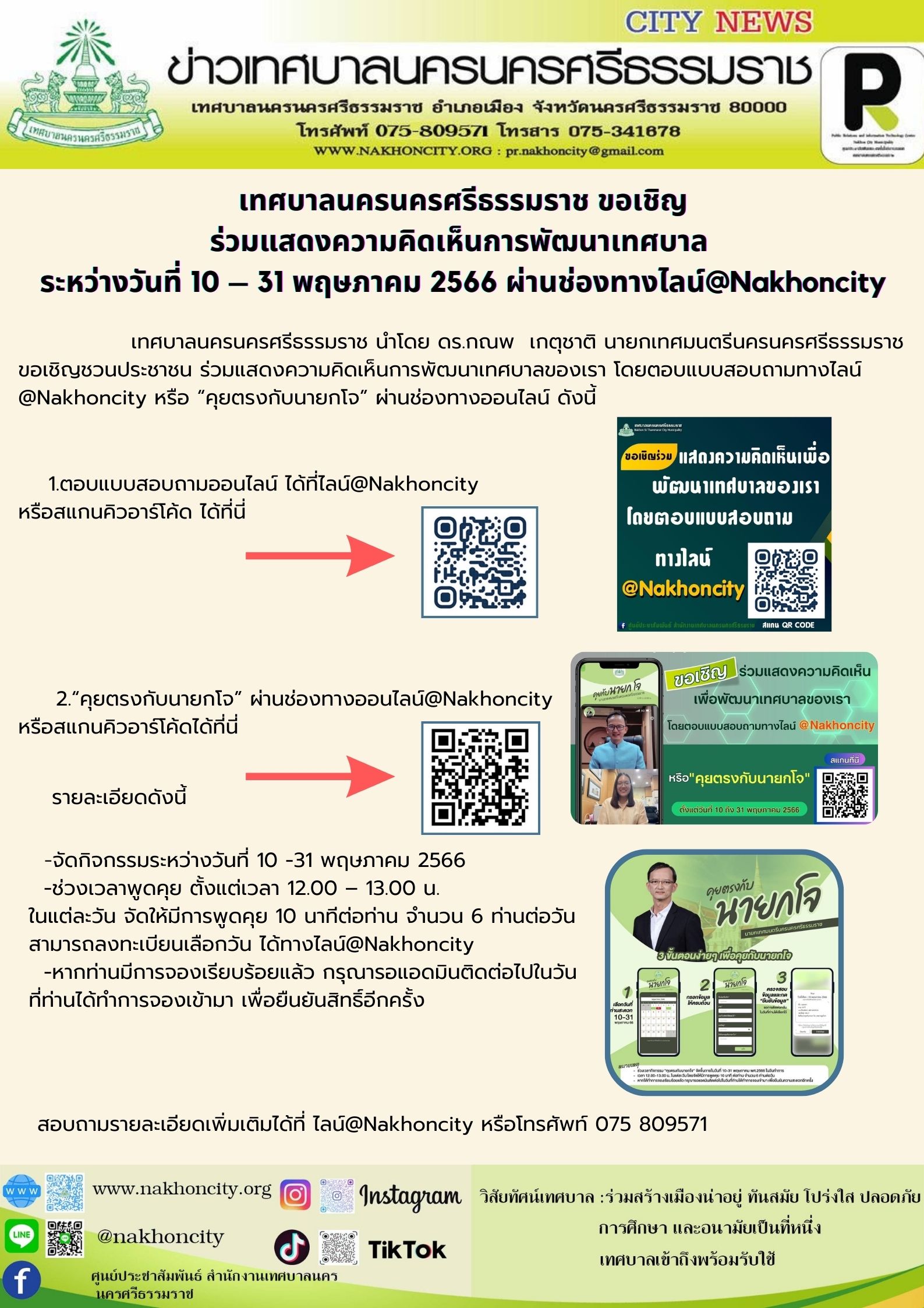 เทศบาลนครนครศรีธรรมราช ขอเชิญ ร่วมแสดงความคิดเห็นการพัฒนาเทศบาล ระหว่างวันที่ 10 – 31 พฤษภาคม 2566 ผ่านช่องทางไลน์@Nakhoncity |