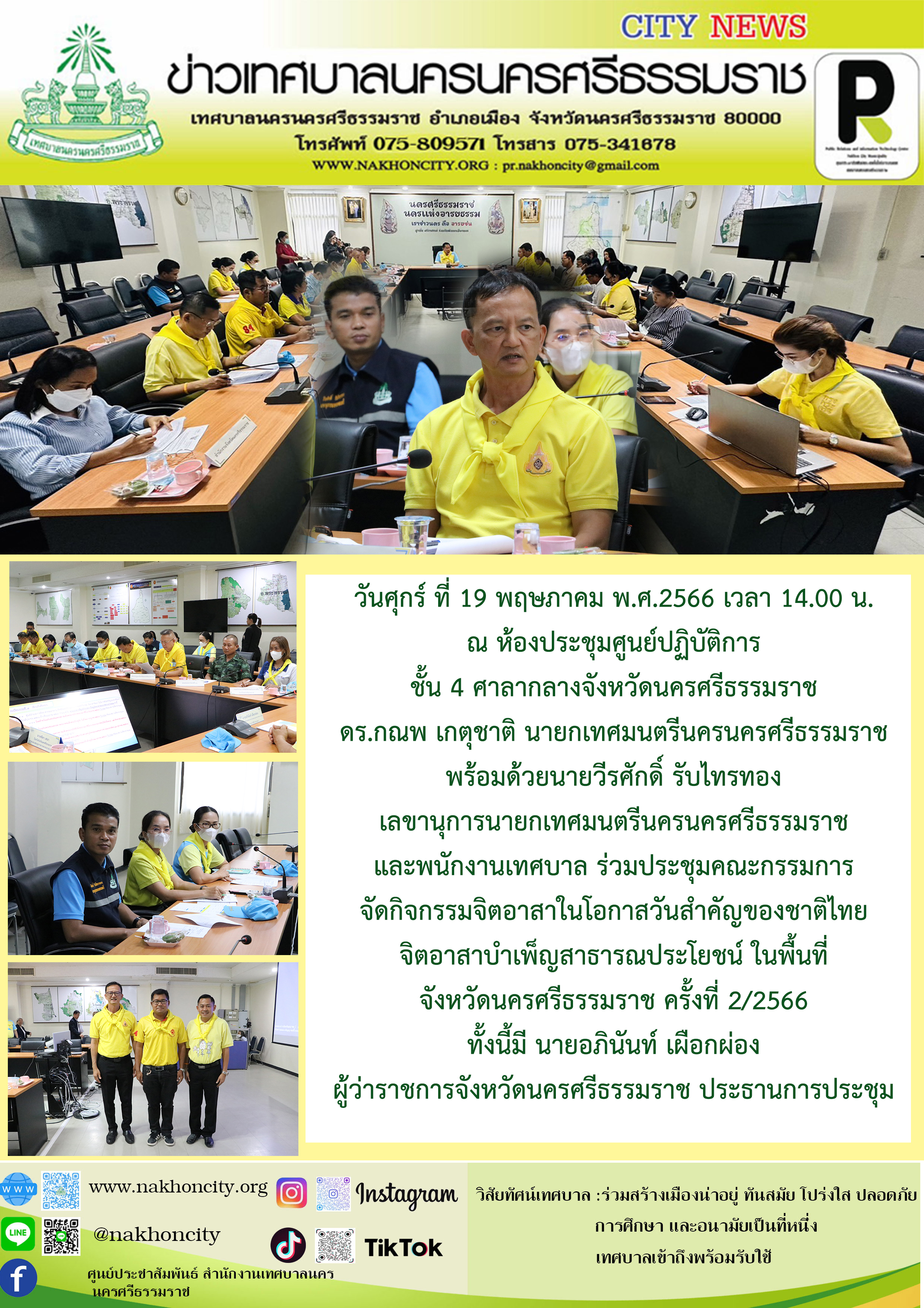 ดร.กณพ เกตุชาติ นายกเทศมนตรีนครนครศรีธรรมราช พร้อมด้วยนายวีรศักดิ์ รับไทรทอง เลขานุการนายกเทศมนตรีนครนครศรีธรรมราช และพนักงานเทศบาล ร่วมประชุมคณะกรรมการจัดกิจกรรมจิตอาสาในโอกาสวันสำคัญของชาติไทย จิตอาสาบำเพ็ญสาธารณประโยชน์ ในพื้นที่จังหวัดนครศรีธรรมราช ครั้งที่ 2/2566