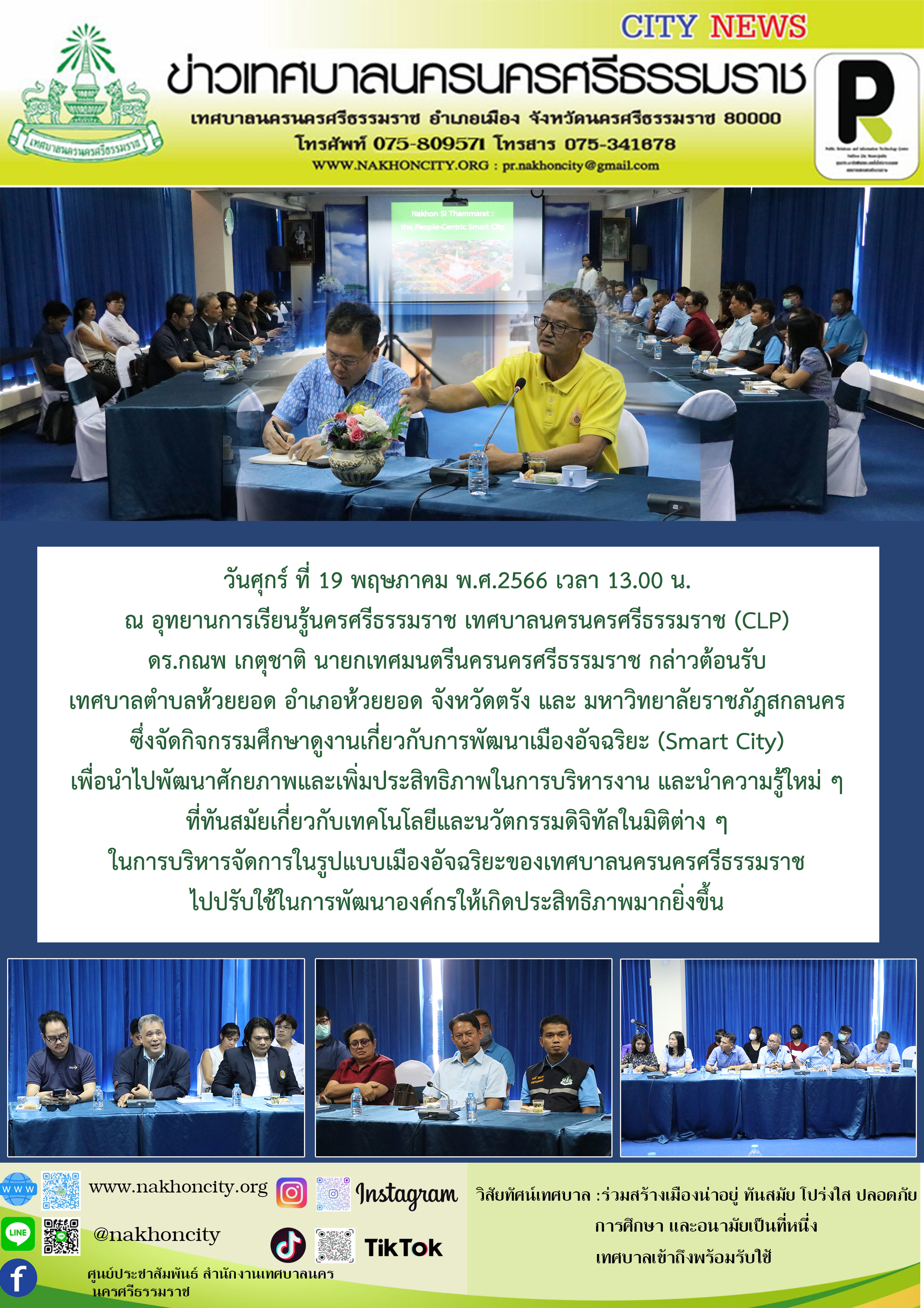 ดร.กณพ เกตุชาติ นายกเทศมนตรีนครนครศรีธรรมราช กล่าวต้อนรับ เทศบาลตำบลห้วยยอด อำเภอห้วยยอด จังหวัดตรัง และ มหาวิทยาลัยราชภัฎสกลนคร ซึ่งจัดกิจกรรมศึกษาดูงานเกี่ยวกับการพัฒนาเมืองอัจฉริยะ (Smart City) |