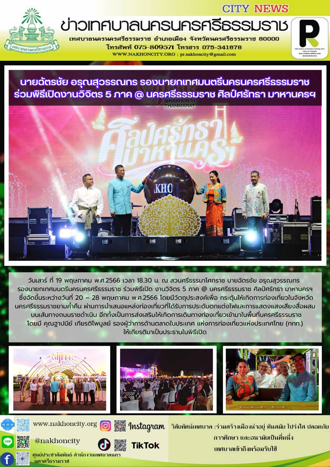 วันเสาร์ ที่ 19 พฤษภาคม พ.ศ.2566 เวลา 18.30 น. ณ สวนศรีธรรมาโศกราช นายฉัตรชัย อรุณสุวรรณกร รองนายกเทศมนตรีนครนครศรีธรรมราช ร่วมพิธีเปิด งานวิจิตร 5 ภาค @ นครศรีธรรมราช ศิลป์ศรัทธา มาหานครฯ ซึ่งจัดขึ้นระหว่างวันที่ 20 – 28 พฤษภาคม พ.ศ.2566 โดยมีวัตถุประสงค์เพื่อ กระตุ้นให้เกิดการท่องเที่ยวในจังหวัดนครศรีธรรมราชยามค่ำคืน ผ่านการนำเสนอแหล่งท่องเที่ยวที่ได้รับการประดับตกแต่งไฟและการแสดงแสงเสียงสื่อผสม บนเส้นทางถนนราชดำเนิน อีกทั้งเป็นการส่งเสริมให้เกิดการเดินทางท่องเที่ยวเข้ามาในพื้นที่นครศรีธรรมราช จากทั้งในภูมิมภาคและข้ามภูมิภาคนั้น โดยมี คุณฐาปนีย์ เกียรติไพบูลย์ รองผู้ว่าการด้านตลาดในประเทศ แห่งการท่องเที่ยวแห่งประเทศไทย (ททท.) ให้เกียรติมาเป็นประธานในพิธีเปิด ............. ภาพ//ข่าว//จันทร์จิรา |