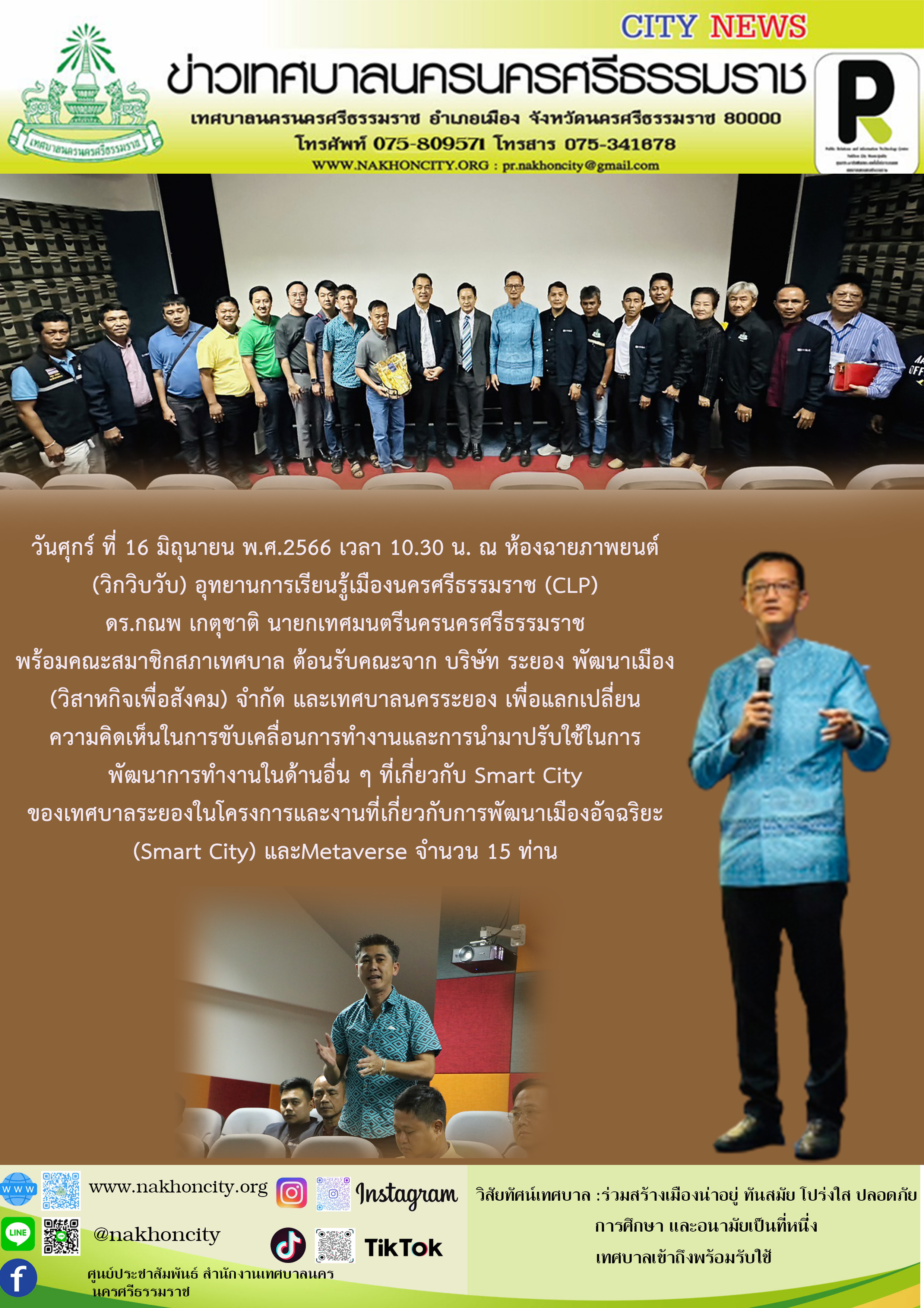 ดร.กณพ เกตุชาติ นายกเทศมนตรีนครนครศรีธรรมราช พร้อมคณะสมาชิกสภาเทศบาล ต้อนรับคณะจาก บริษัท ระยอง พัฒนาเมือง (วิสาหกิจเพื่อสังคม) จำกัด และเทศบาลนครระยอง |