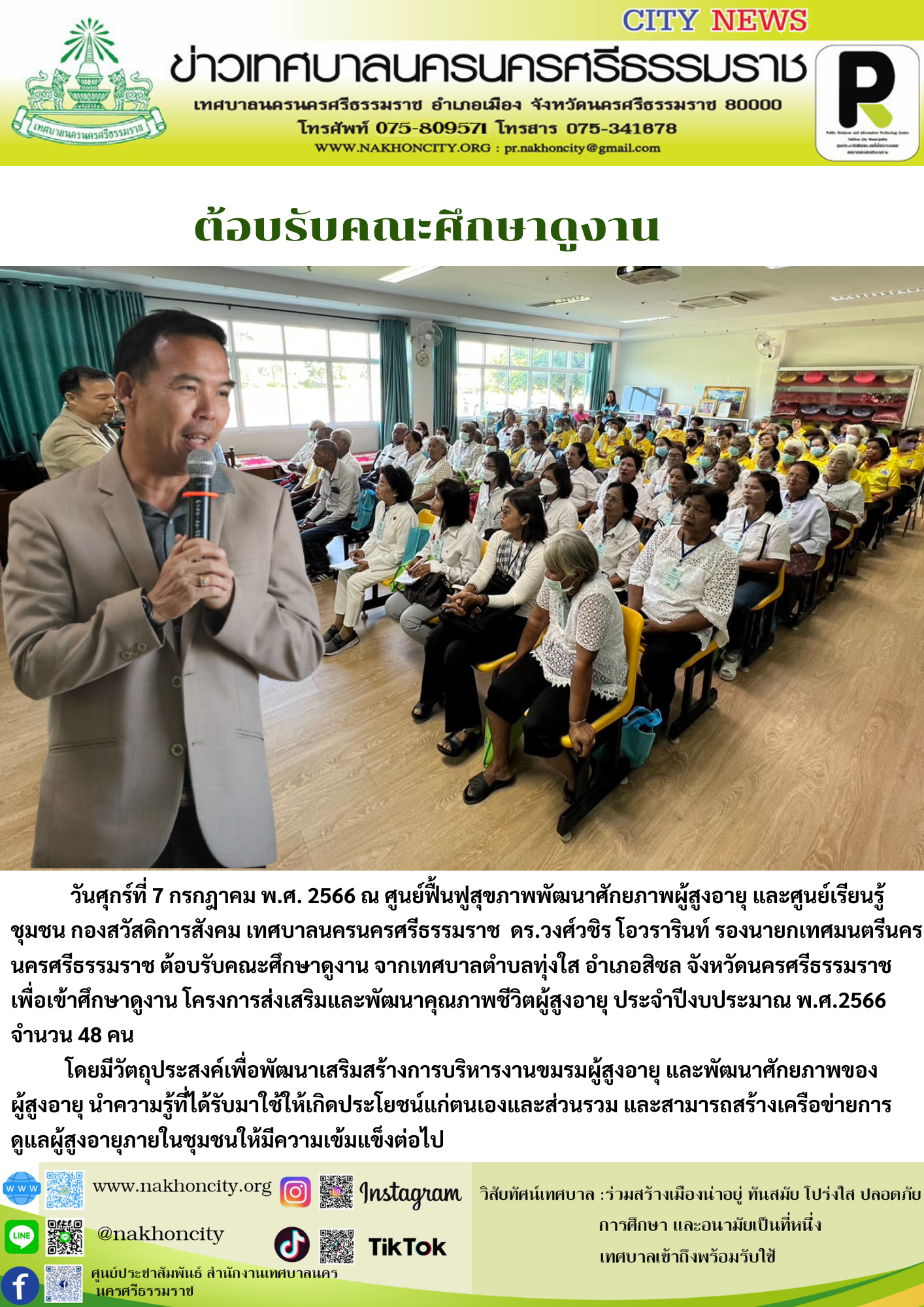 วันศุกร์ที่ 7 กรกฎาคม พ.ศ. 2566 ณ ศูนย์ฟื้นฟูสุขภาพพัฒนาศักยภาพผู้สูงอายุ และศูนย์เรียนรู้ชุมชน กองสวัสดิการสังคม เทศบาลนครนครศรีธรรมราช ดร.วงศ์วชิร โอวรารินท์ รองนายกเทศมนตรีนครนครศรีธรรมราช ต้อบรับคณะศึกษาดูงาน จากเทศบาลตำบลทุ่งใส อำเภอสิซล จังหวัดนครศรีธรรมราช เพื่อเข้าศึกษาดูงาน โครงการส่งเสริมและพัฒนาคุณภาพชีวิตผู้สูงอายุ ประจำปีงบประมาณ พ.ศ.2566 จำนวน 48 คน โดยมีวัตถุประสงค์เพื่อพัฒนาเสริมสร้างการบริหารงานขมรมผู้สูงอายุ และพัฒนาศักยภาพของผู้สูงอายุ นำความรู้ที่ได้รับมาใช้ให้เกิดประโยชน์แก่ตนเองและส่วนรวม และสามารถสร้างเครือข่ายการดูแลผู้สูงอายุภายในชุมชนให้มีความเข้มแข็งต่อไป |