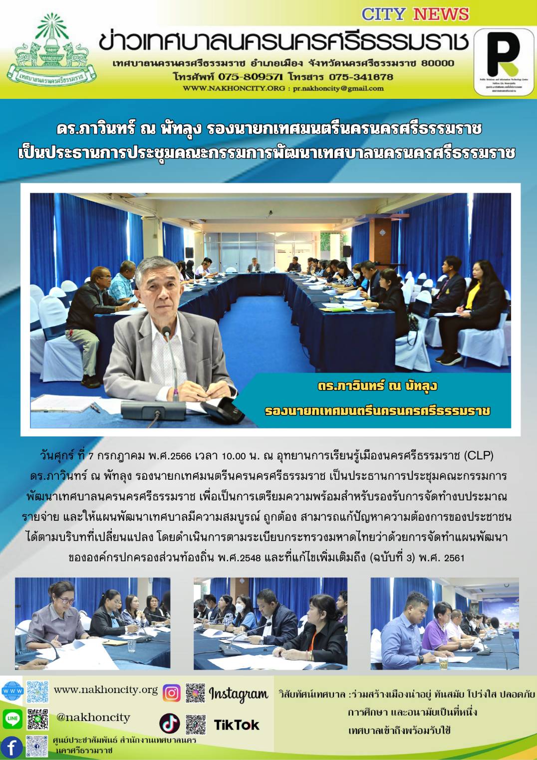 ดร.ภาวินทร์ ณ พัทลุง รองนายกเทศมนตรีนครนครศรีธรรมราช เป็นประธานการประชุมคณะกรรมการพัฒนาเทศบาลนครนครศรีธรรมราช |