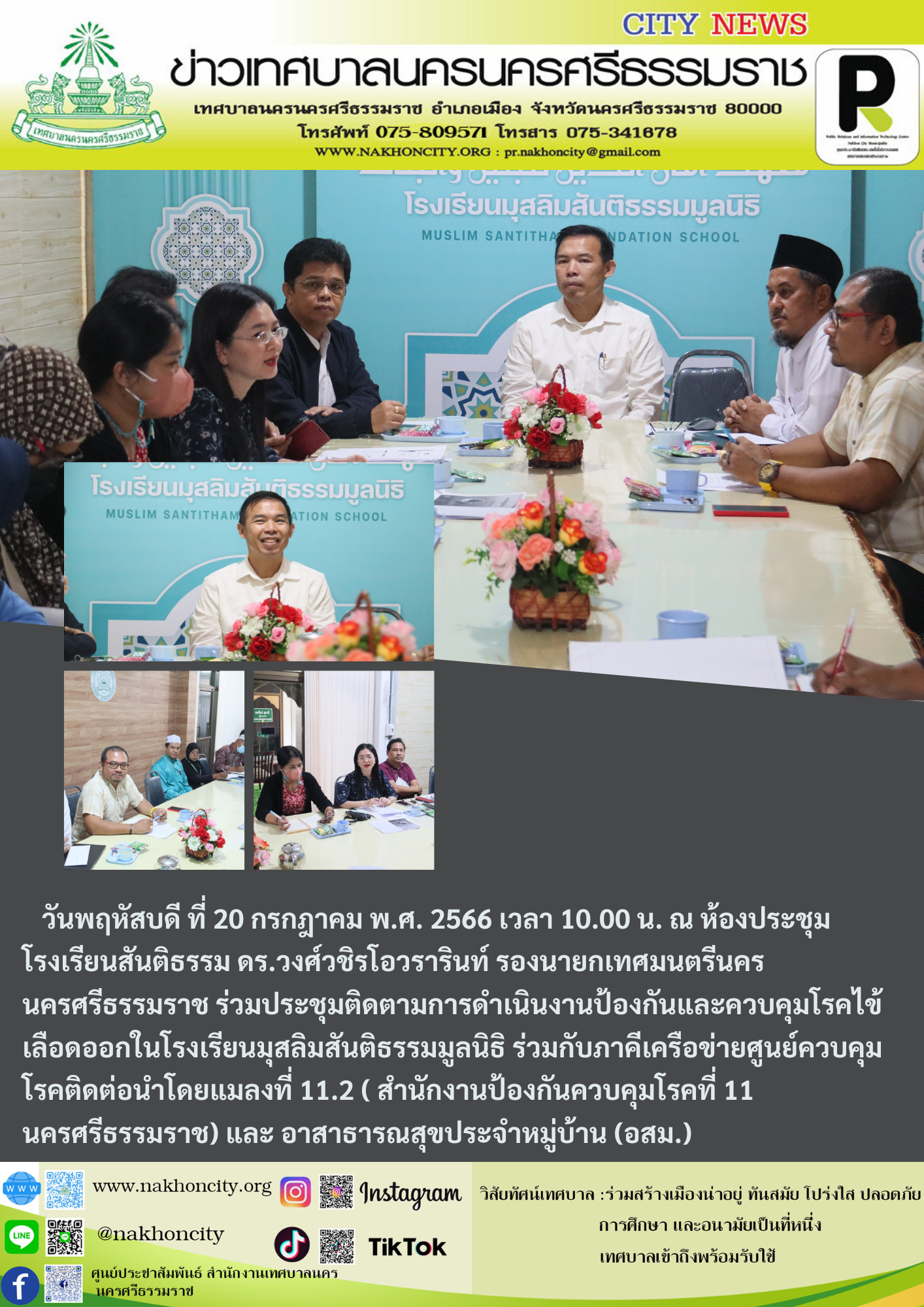วันพฤหัสบดี ที่ 20 กรกฎาคม พ.ศ. 2566 เวลา 10.00 น. ณ ห้องประชุมโรงเรียนสันติธรรม  ดร.วงศ์วชิร  โอวรารินท์  รองนายกเทศมนตรีนครนครศรีธรรมราช  ร่วมประชุมติดตามการดำเนินงานป้องกันและควบคุมโรคไข้เลือดออกในโรงเรียนมุสลิมสันติธรรมมูลนิธิ ร่วมกับภาคีเครือข่ายศูนย์ควบคุมโรคติดต่อนำโดยแมลงที่ 11.2 ( สำนักงานป้องกันควบคุมโรคที่ 11 นครศรีธรรมราช) และ อาสาธารณสุขประจำหมู่บ้าน (อสม.)