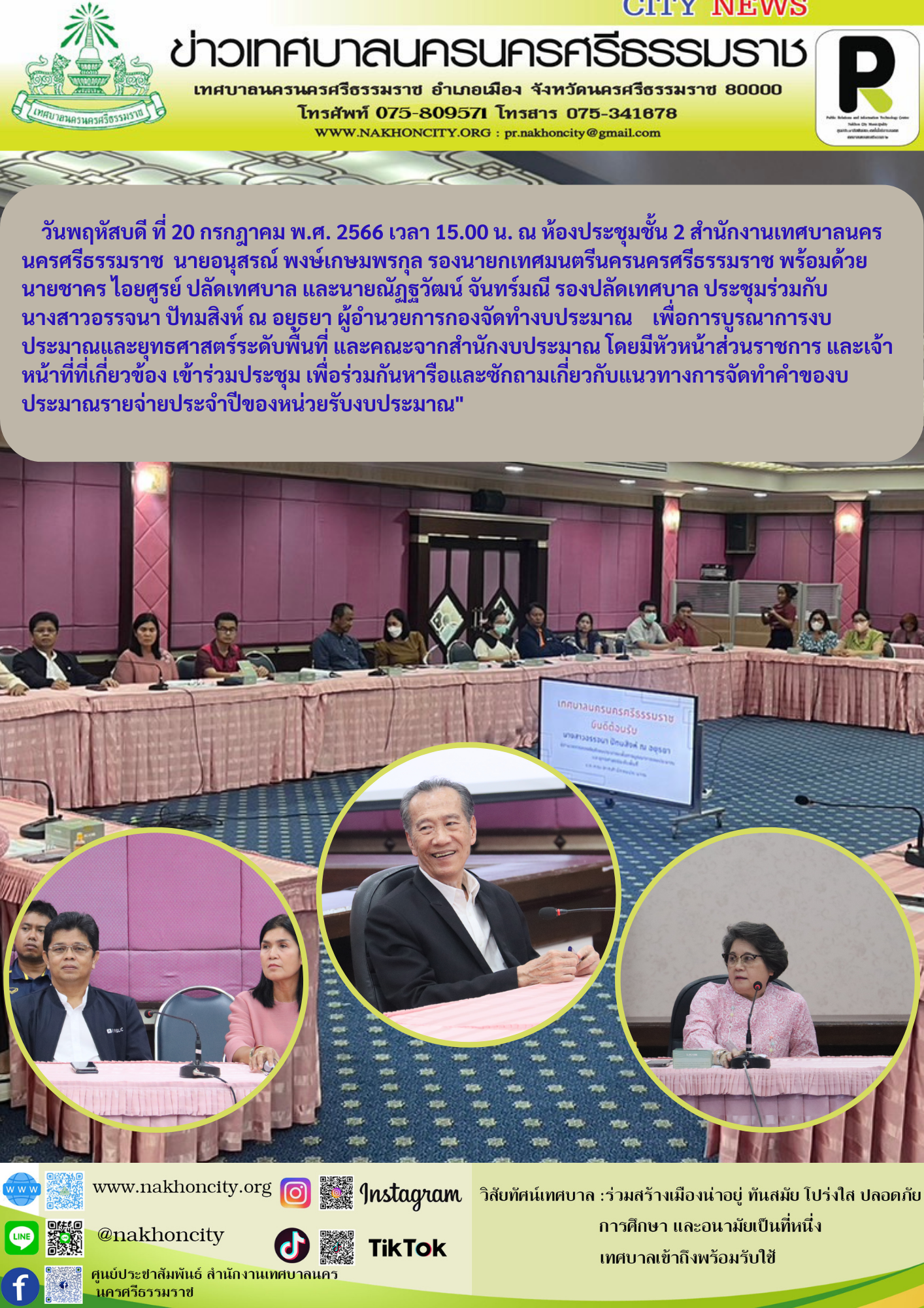 วันพฤหัสบดี ที่ 20 กรกฎาคม พ.ศ. 2566 เวลา 15.00 น. ณ ห้องประชุมชั้น 2 สำนักงานเทศบาลนครนครศรีธรรมราช นายอนุสรณ์ พงษ์เกษมพรกุล รองนายกเทศมนตรีนครนครศรีธรรมราช พร้อมด้วย นายชาคร ไอยศูรย์ ปลัดเทศบาล และนายณัฏฐวัฒน์ จันทร์มณี รองปลัดเทศบาล ประชุมร่วมกับ นางสาวอรรจนา ปัทมสิงห์ ณ อยุธยา ผู้อำนวยการกองจัดทำงบประมาณเพื่อการบูรณาการงบประมาณและยุทธศาสตร์ระดับพื้นที่ และคณะจากสำนักงบประมาณ โดยมีหัวหน้าส่วนราชการ และเจ้าหน้าที่ที่เกี่ยวข้อง เข้าร่วมประชุม เพื่อร่วมกันหารือและซักถามเกี่ยวกับแนวทางการจัดทำคำของบประมาณรายจ่ายประจำปีของหน่วยรับงบประมาณ" |